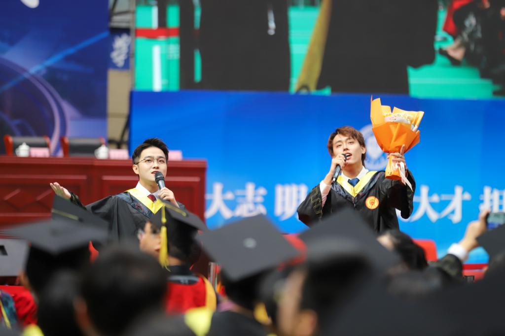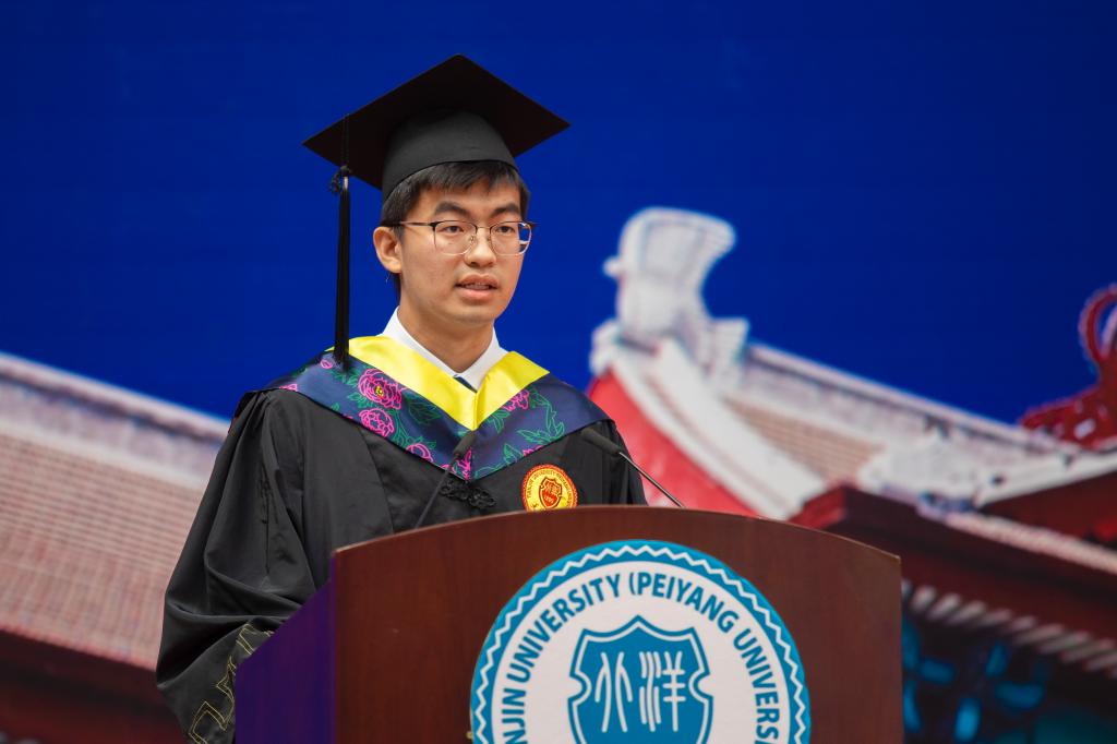 “为学之道成其气,为事之道铸其骨,为人之道凝其神。”自动化学院自动化专业本科生董子豪代表全体毕业生发言,他动情回忆大一暑假时自己因为脑部肿瘤接受手术,生活一度充满灰暗,是辅导员的鼓励、班导师的关怀,让他重拾生活的勇气。在天大校园,董子豪走出阴霾。作为第17期太雷班学员,他每一次讲解张太雷学长事迹时,都深深感动于那句为人民“谋将来永远幸福”的铮铮誓言。现在,董子豪选择参加研究生支教团,赴甘肃支教一年,回到黄土地为山里的孩子插上梦想的翅膀。“为家乡父老做一点事情,为乡村振兴贡献一份天大力量!小我融入大我、青春献给祖国,这是天大教会我的重要一课。”