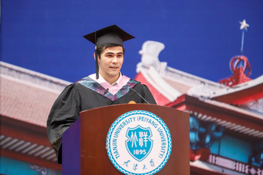 “两千年前,丝绸之路将我的祖国与中国紧密相连;两千年后的今天,我沿着‘一带一路’来到中国——对我来说,这就是天大的缘分!”国际教育学院汉语言专业本科生、来自土库曼斯坦的留学生代表穆罕用三个关键词回顾了自己的大学生活——“感谢”、“担当”和“展望”,他表示,自己时刻准备在中国与土库曼斯坦乃至中亚各国相互交流、携手发展的大浪潮中贡献绵薄之力,还向全场师生朗诵了他改编的《再别康桥》:不舍的毕业了/正如我慕名而来/我轻轻的招手/作别天大的云彩/青年湖畔的金柳/汇聚着年轻的梦想/师生们奋斗的身影/让我回味而难忘/而我不会忘却/这里是我可爱的母校/无论天涯何处/天大就是我的康桥!