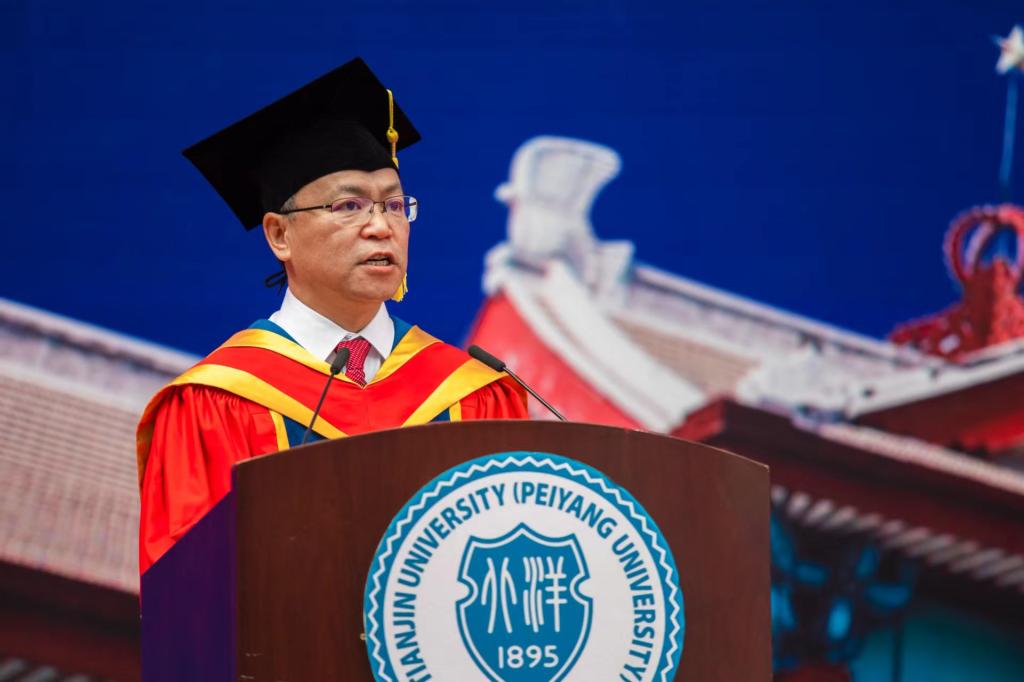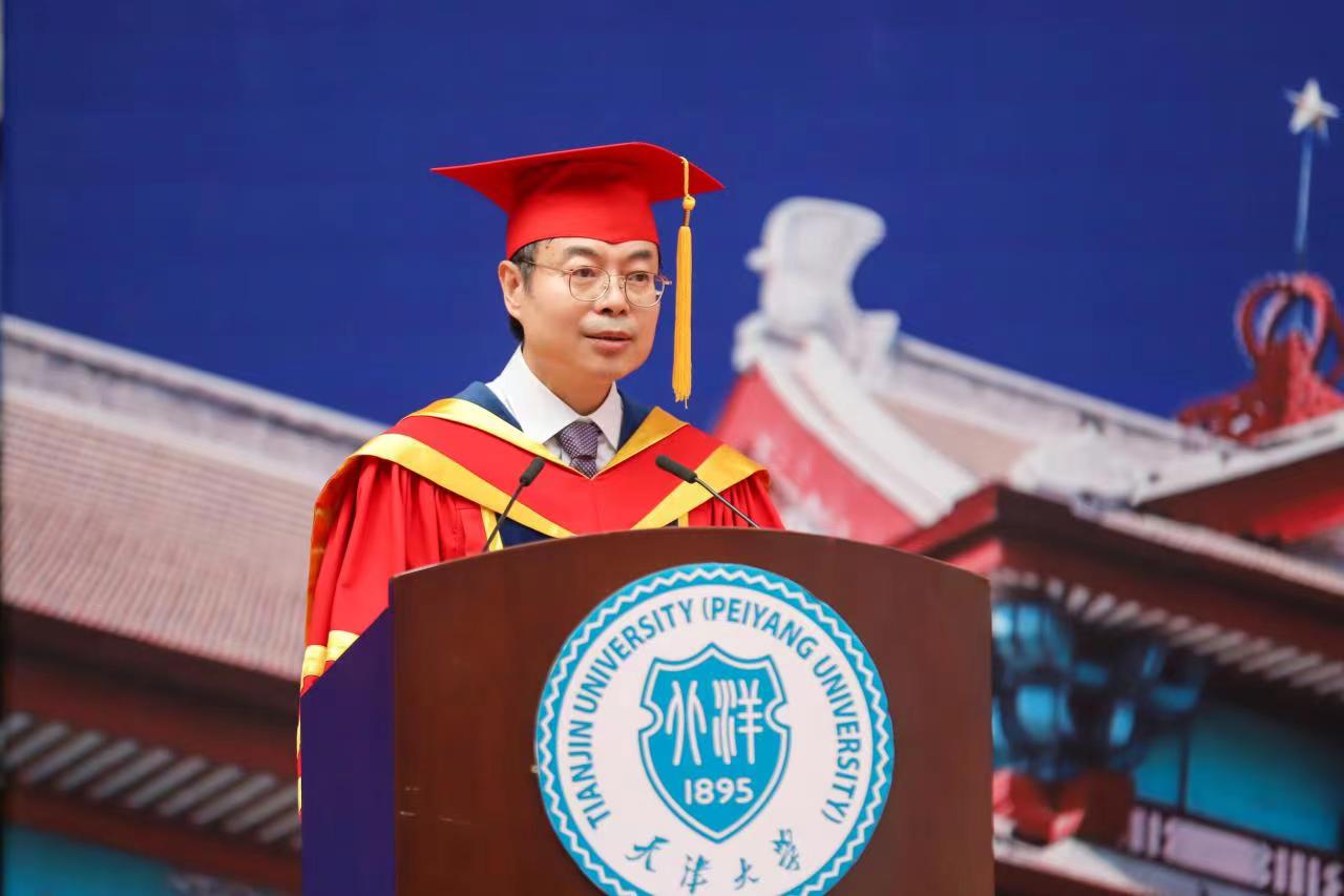 “向全体毕业生表示热烈祝贺,向今天回家的年轻校友们表示诚挚的欢迎,向悉心指导你们的老师和关心支持你们的家人表示衷心的感谢!”中国工程院院士、天津大学校长金东寒向毕业生致以热情洋溢的祝福,希望他们能够涵养“天大的气韵”——古与今交融的大学之气、刚与柔交错的大学之灵、动与静交织的大学之韵。金东寒嘱托全体毕业生离开校园后要继续做好一名“天大人”:做天大人,要有天大志,立志做对祖国和人民有用的人,只要心怀祖国和人民,就可以成为所扎根热土上的先锋、所服务人民心中的英雄;做天大人,要有天大情,懂得感恩的真谛并能知恩图报,要感谢每一段成功与失败的经历,练就百折不挠的韧劲,做一个用自己的光芒去照亮他人前路的“发光者”;做天大人,要有天大勇,“国家对你们有期待,学校对你们有责任,社会对你们有要求。日后,在风雨来临之际,希望你们不害怕、不退缩,要有迎难而上的决心,更要有为他人遮风挡雨的勇气!”