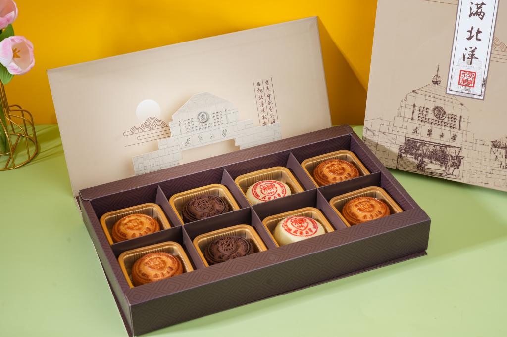 今年,天津大学推出了“月满北洋”和“飨月天大”两个主题的文创月饼礼盒,月饼的造型、包装设计均由校内学生担纲。“月满北洋”主题延续历年天大月饼礼盒的传统风格,将校徽、校训、北洋纪念亭等学校标志性元素刻印在包装、提袋和月饼纹饰上,设有团圆版、纪念版、校徽版、糖醇版4种款式供人挑选,制作工艺则分为广式、乳酪、冰沙三大类。除了五仁、黑芝麻、莲蓉蛋黄等经典口味,今年的新款月饼还囊括了牛油果、水蜜桃、板栗等“网红款”;“飨月天大”主题则以书签礼盒为特色,又细分出“北洋洞天”与“花堤游月”两款不同选择:“北洋洞天”款整体以深蓝为主色,搭配立体线稿描绘出的“1895 Tianjin”字样;“花堤游月”款将饱含天大特色的牛顿苹果树和“天津大学星”作为设计元素,内部包装以镂空的“北洋盾”为窗,将天大美景以框景呈现,让品尝者在细嚼月饼的时候,也能徜徉天大秋色。据了解,目前学校已开通线上线下双通道同时售卖,为广大师生校友提供了便捷的购买渠道与多样化的选择。