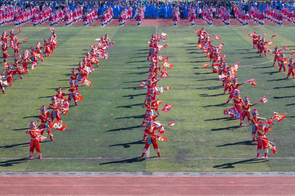 升旗仪式在主席台前举行,全场师生齐唱国歌,向五星红旗庄严行注目礼。