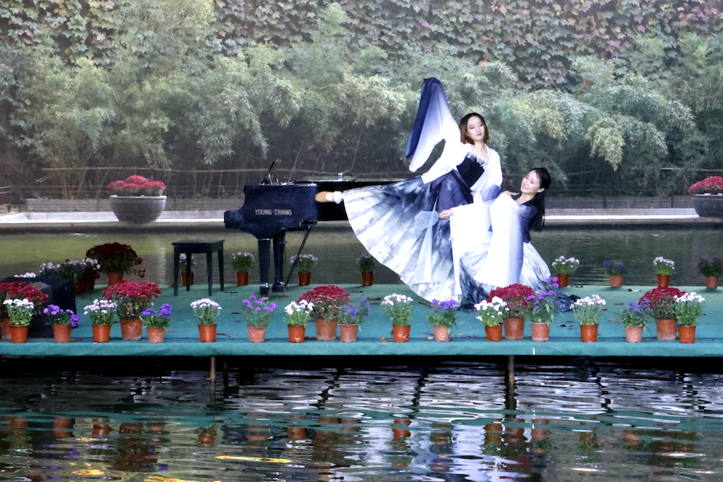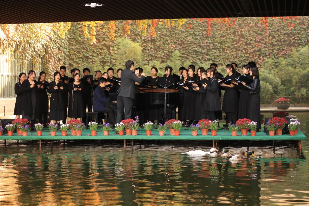 2020年第二届红叶季,适逢天津大学125周年校庆和冯研院15周年院庆,澄心池上第一次搭起舞台,一台文艺界名人荟萃的“双庆诗歌音乐会” 令人难忘。今年红叶季又一次搭起水上舞台,不仅有红叶、碧水、翠竹、锦鲤相映成趣的天然布景,还多了两只黑天鹅和一群野鸭绕台嬉游,与人合鸣。