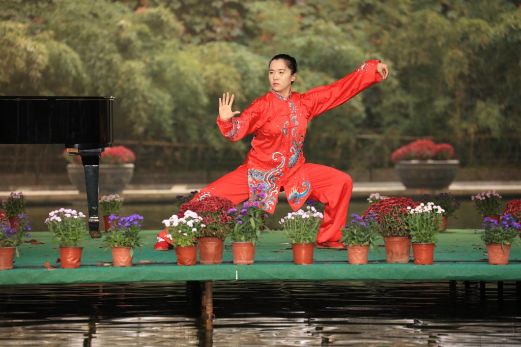 天津交响乐团钢琴家张乐独奏一曲柴可夫斯基《四季·十月秋之歌》,带来西方古典音乐里秋的静谧之美。一袭红衣的世界太极拳冠军于萌萌,则用刚柔并济的太极拳展示出中国武术动若秋风、静若秋水的韵味。