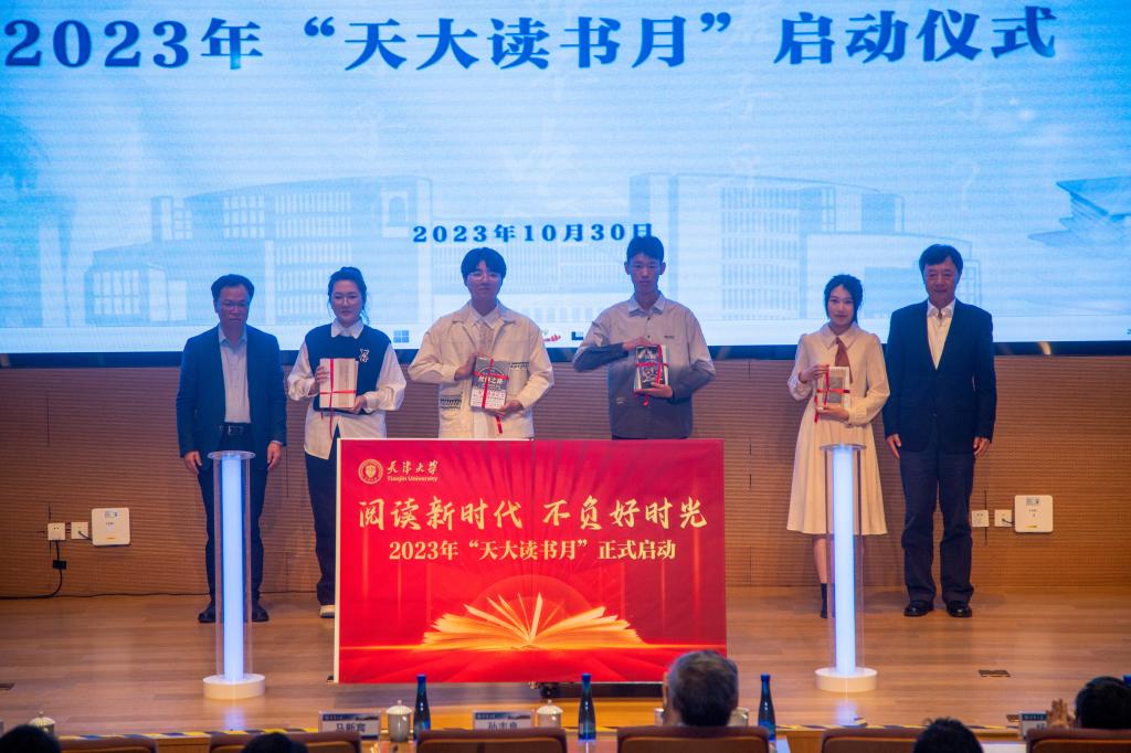 天津大学紧密结合“书香中国”“书香天津”活动安排,鼓励师生把读书作为一种生活方式。启动仪式上,孙志良与马新宾共同点亮象征“阅读之光”的灯柱,一组“书页”缓缓翻开,呈现出“阅读新时代,不负好时光”的年度主题,2023年“天大读书月”的序幕由此拉开。仪式上,领导嘉宾为天津大学学生代表赠送《共产党宣言》《习近平用典》《丝绸之路》《天津文化地图》等经典著作。