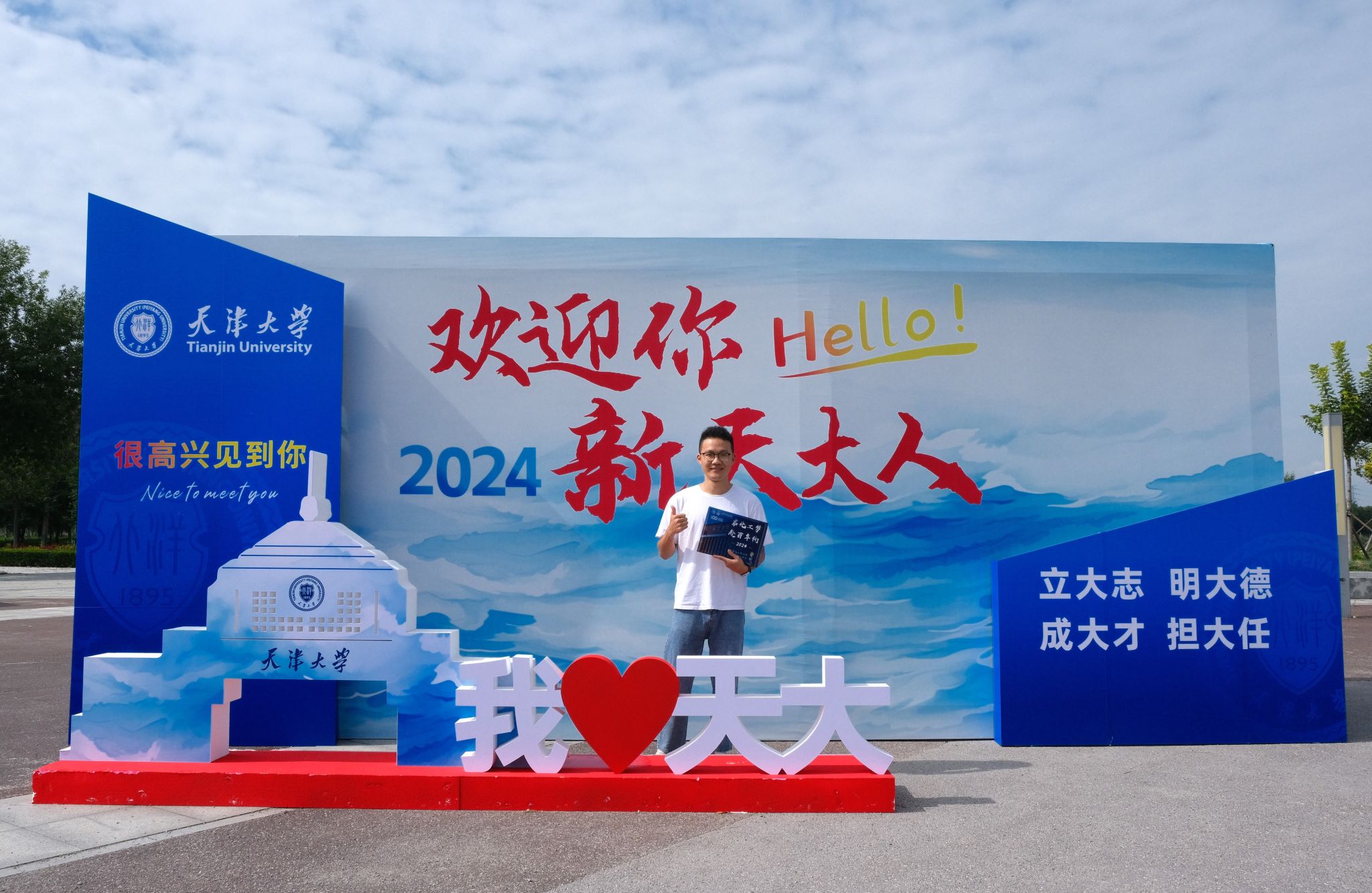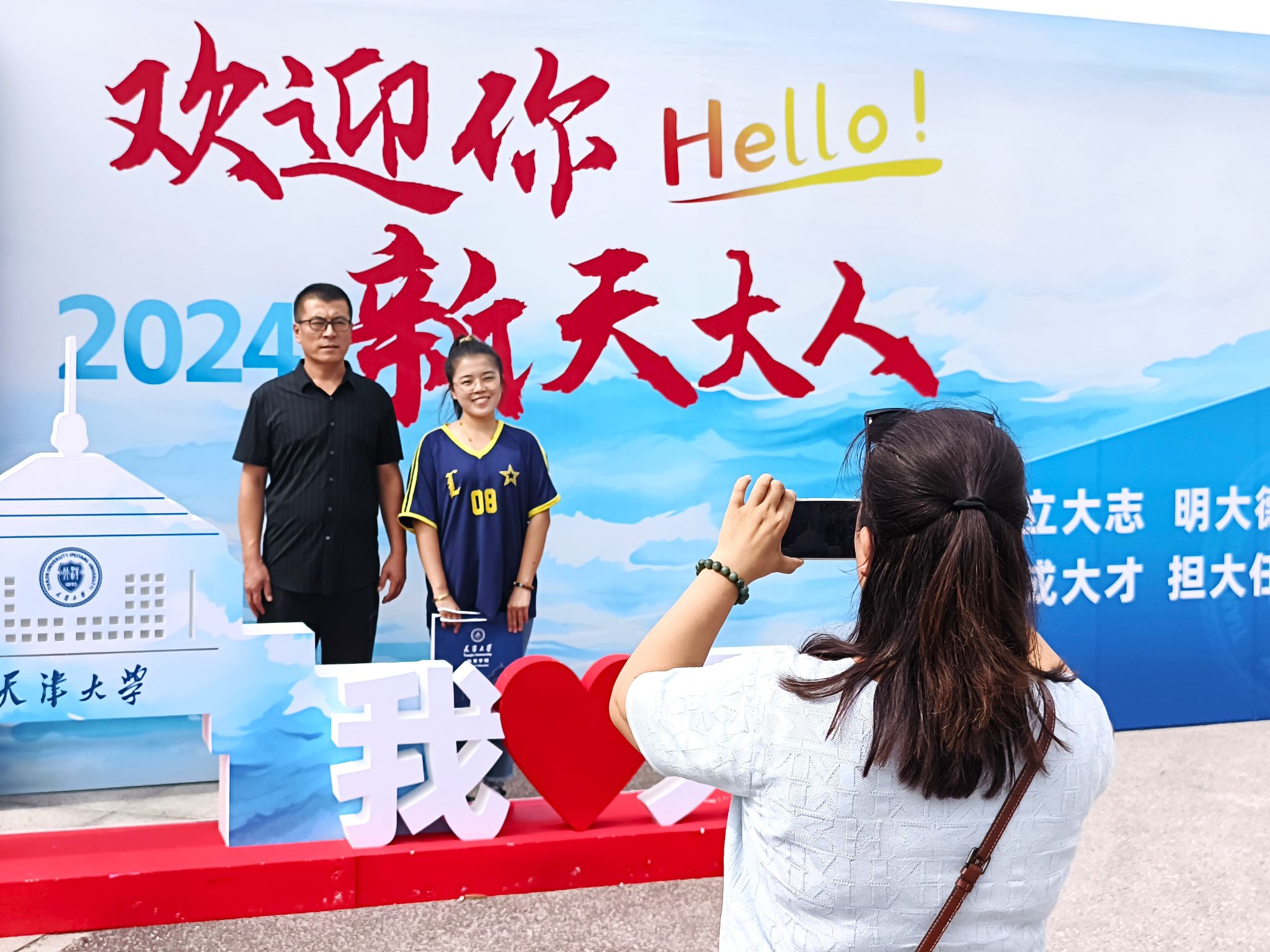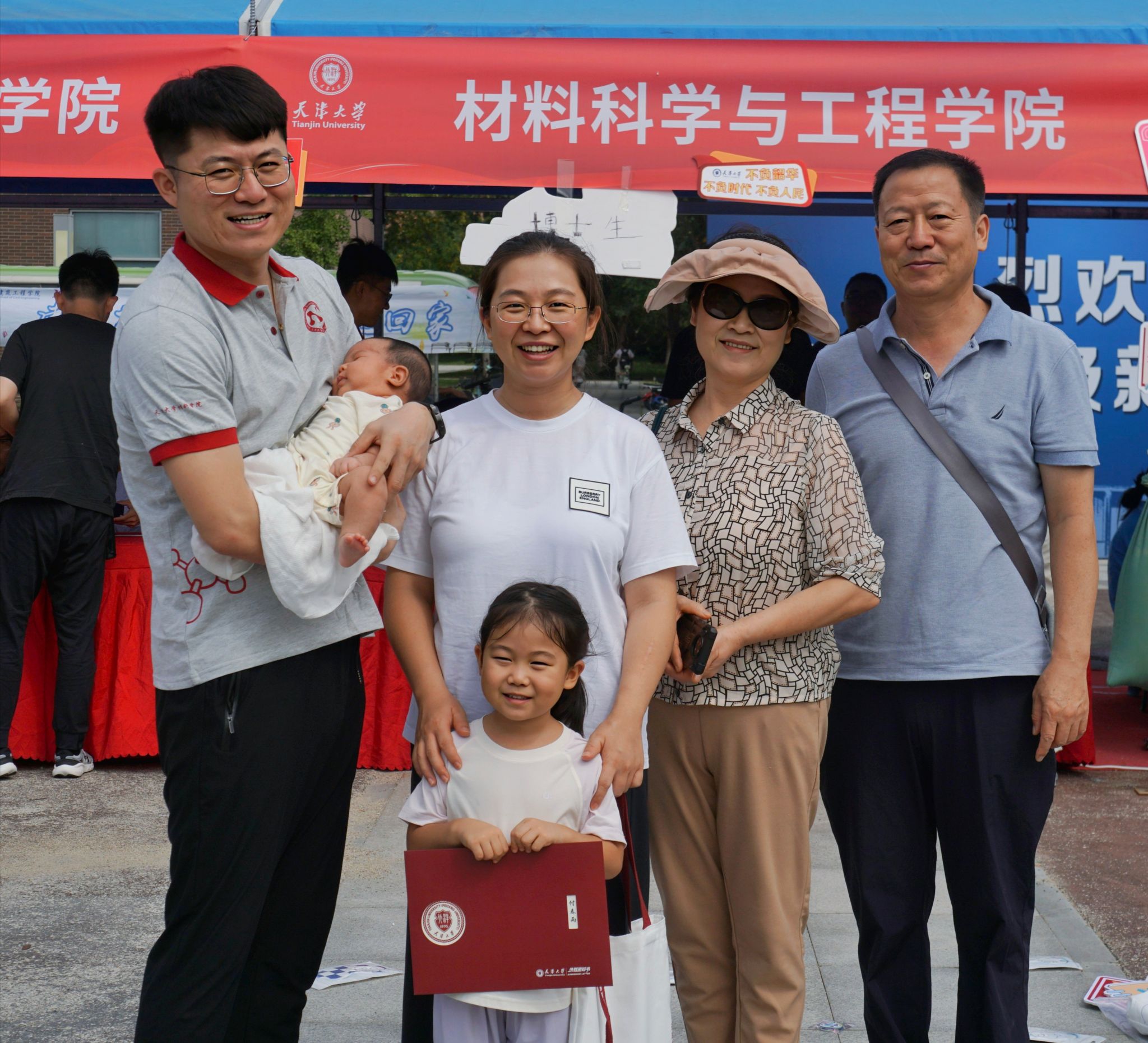 在材料学院迎新点,2024级工程博士付春雨带着父母妻子和两个女儿一起来报到,其中小女儿只有42天。完成报到手续后,现场的志愿者为这一家人拍下了幸福的全家福。1987年出生的付春雨已经37岁,在北京卫星环境工程研究所工作,为了提升自己他选择继续到天津大学继续攻读博士。