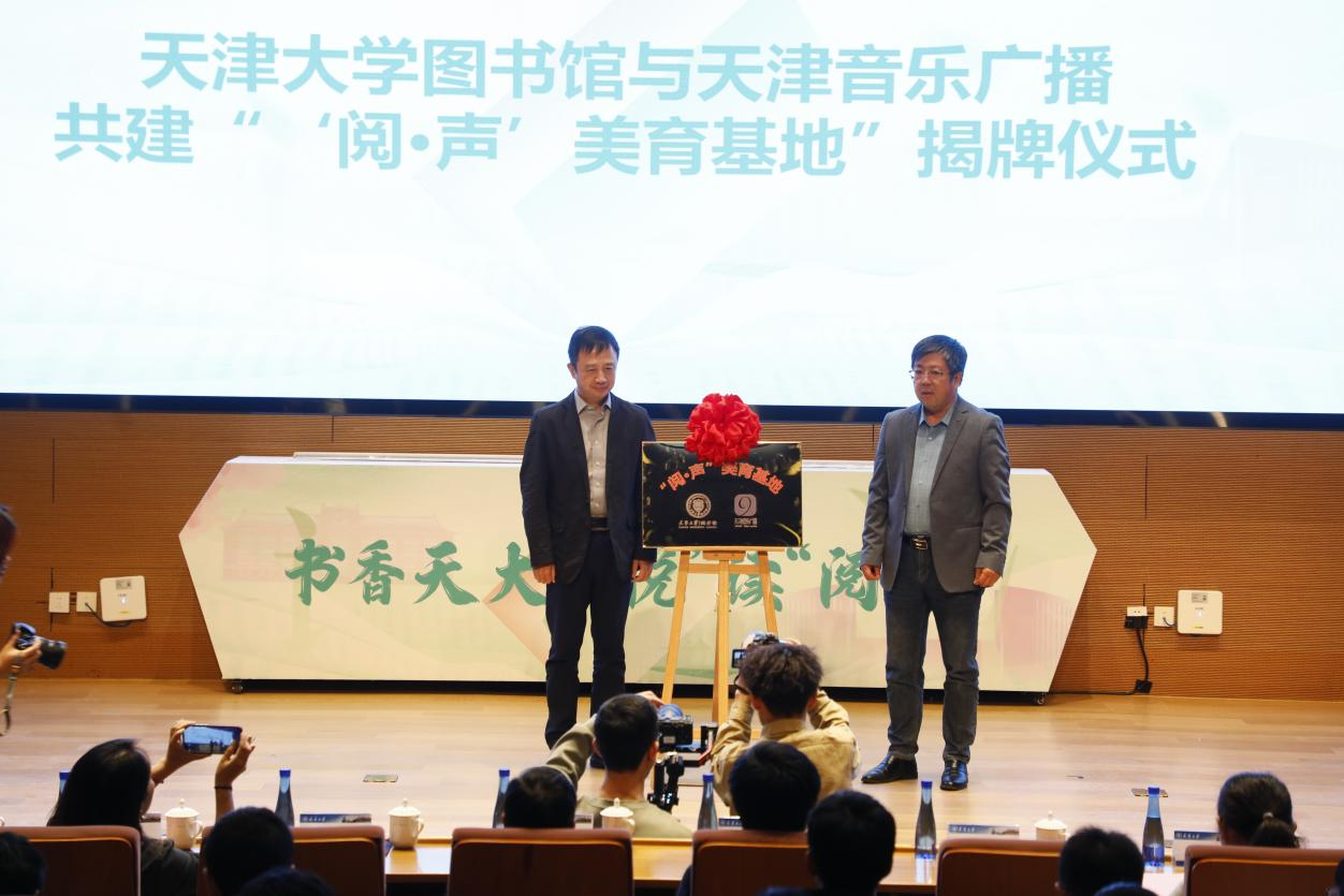 仪式上,王格与张超英共同为天津大学图书馆与天津海河传媒中心音乐广播共建的“阅·声”美育基地揭牌。基地建立后将聘任声音艺术导师,为天大学子在朗诵、主持、音乐欣赏等方面提供专业指导,举办“有声阅读”“音乐美育”等特色活动,用声音传递阅读的力量,提升大学生的审美素养,建立服务校园与社会的阅读推广合作平台。