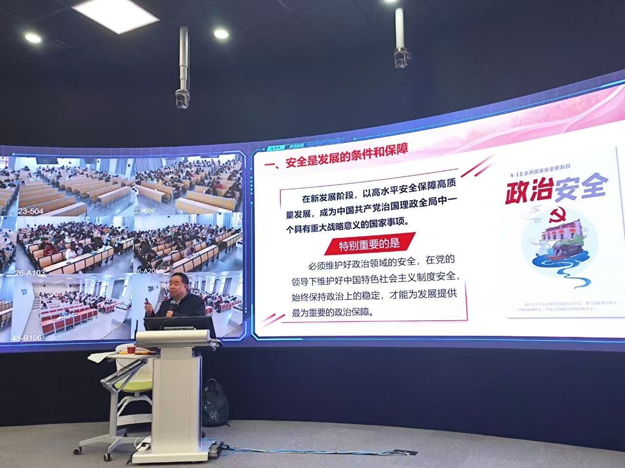 “全面加强国家安全教育,提高各级领导干部统筹发展和安全能力,增强全民国家安全意识和素养,筑牢国家安全人民防线。”这是党的二十大报告从党和国家事业发展战略全局出发,设专章对“推进国家安全体系和能力现代化,坚决维护国家安全和社会稳定”进行的部署要求。天津大学深入贯彻落实习近平总书记关于教育、国家安全的重要论述,校党委书记杨贤金亲自挂帅担任课程负责人,马克思主义学院颜晓峰院长和法学院孙佑海院长牵头,10位国家安全及交叉学科领域的专家学者组团,17个学院(部)的36位实践导师参与,以“1+36”全景智慧教室共同授课模式,面向5000多名大一新生开设《国家安全教育》数智化公共基础课,提升学生国家安全意识、提高维护国家安全能力,培养担当民族复兴大任的时代新人。