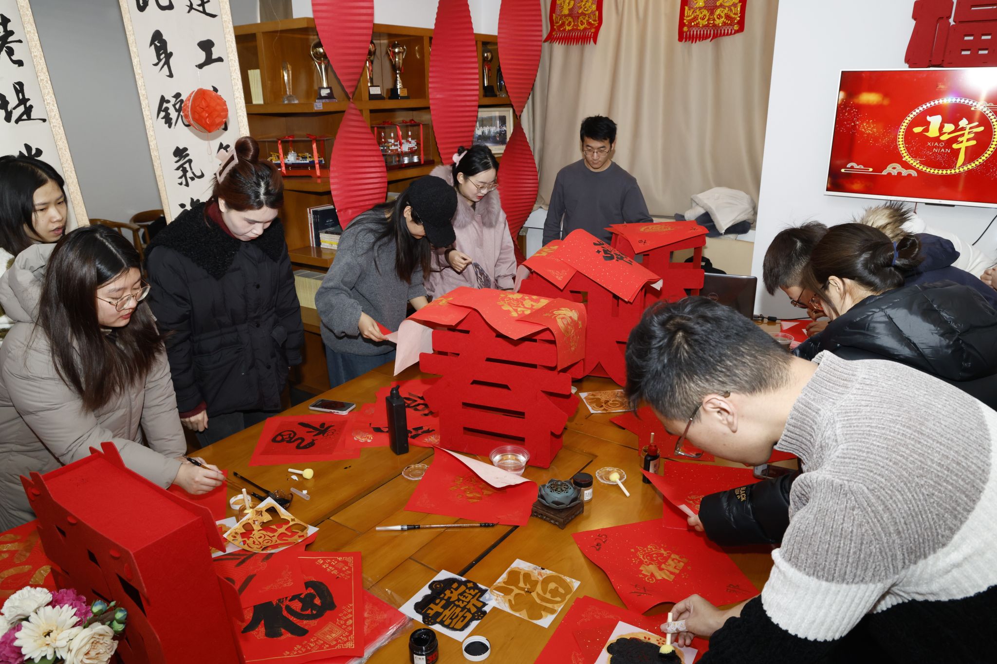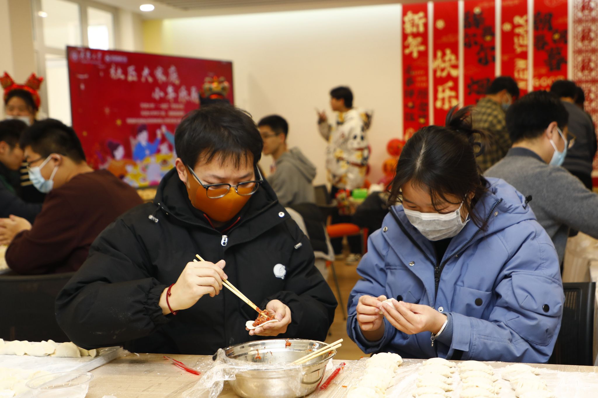 天津大学在北洋园校区齐园15斋、诚园6斋和卫津路校区鹏翔4斋设立三个点位,组织精彩活动吸引留校师生喜气洋洋迎接新年到来。记者在现场看到:“一站式”学生社区张灯结彩,年味十足。天津特色吊钱儿、拉花、福字等装饰品营造出浓厚的节日氛围,糖瓜、水果、干果、饮料等摆放整齐。各学院领导干部、师友导师、班主任、辅导员和物业服务人员也都一起参与传统习俗活动,大家一起包饺子、摇元宵、剪窗花、拓年画、写福字,欢声笑语不断。
