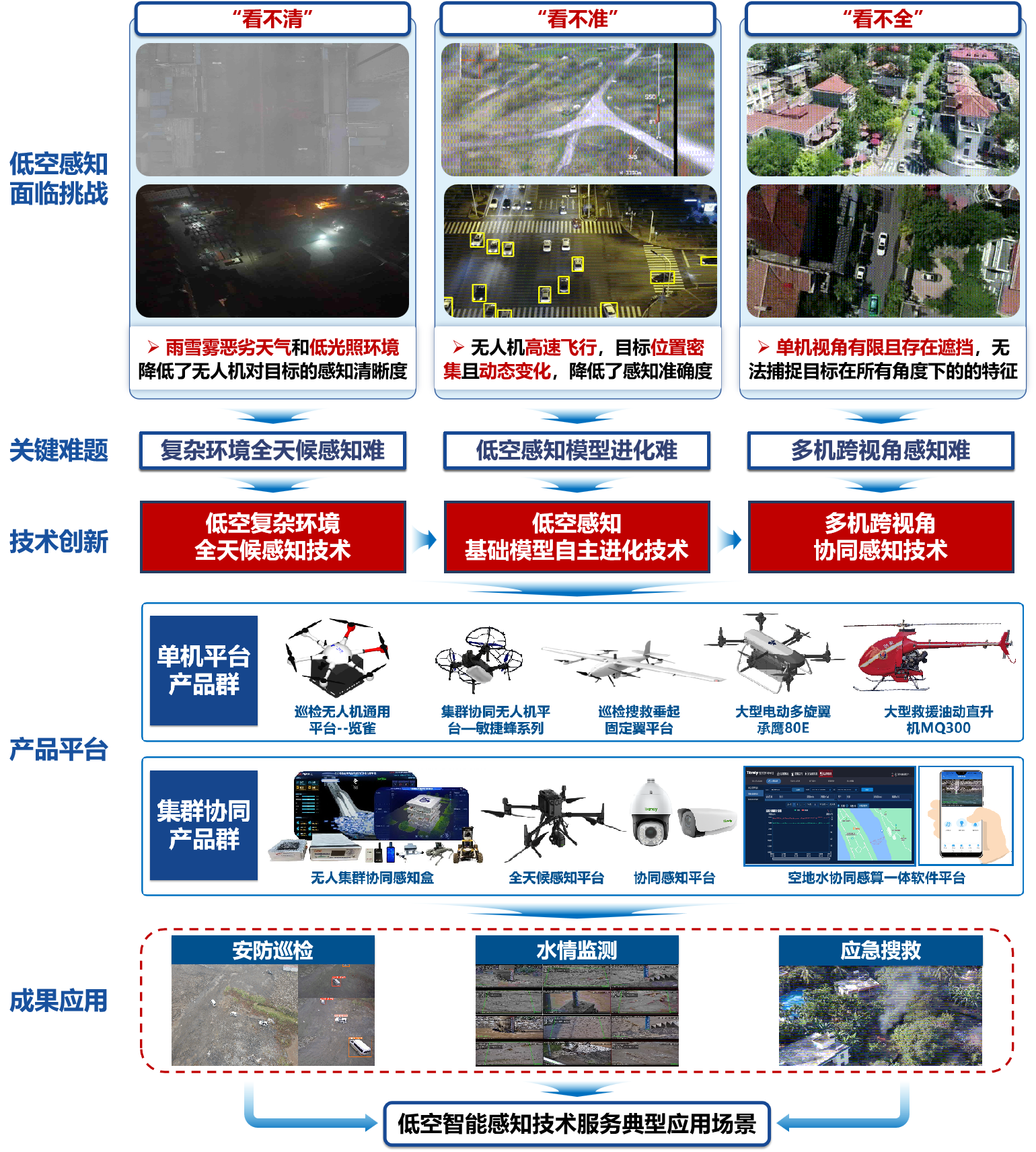 低空,通常指距离地面1000米以下的空域,是无人机、飞行汽车等新型飞行器的主要活动区域。近年来,随着无人机物流、飞行汽车、低空旅游等新兴产业的快速发展,低空经济已成为全球经济增长的新引擎。低空智能感知技术作为低空经济的核心支撑,正在为这一领域注入强劲动力。然而,低空环境的复杂性给智能感知带来了巨大挑战:恶劣天气和低光照条件下,传感器容易“看不清”;低空场景动态变化频繁、地面目标密集,导致“看不准”;多无人机协同作业时,视角差异大、目标易被遮挡,难以“看得全”。