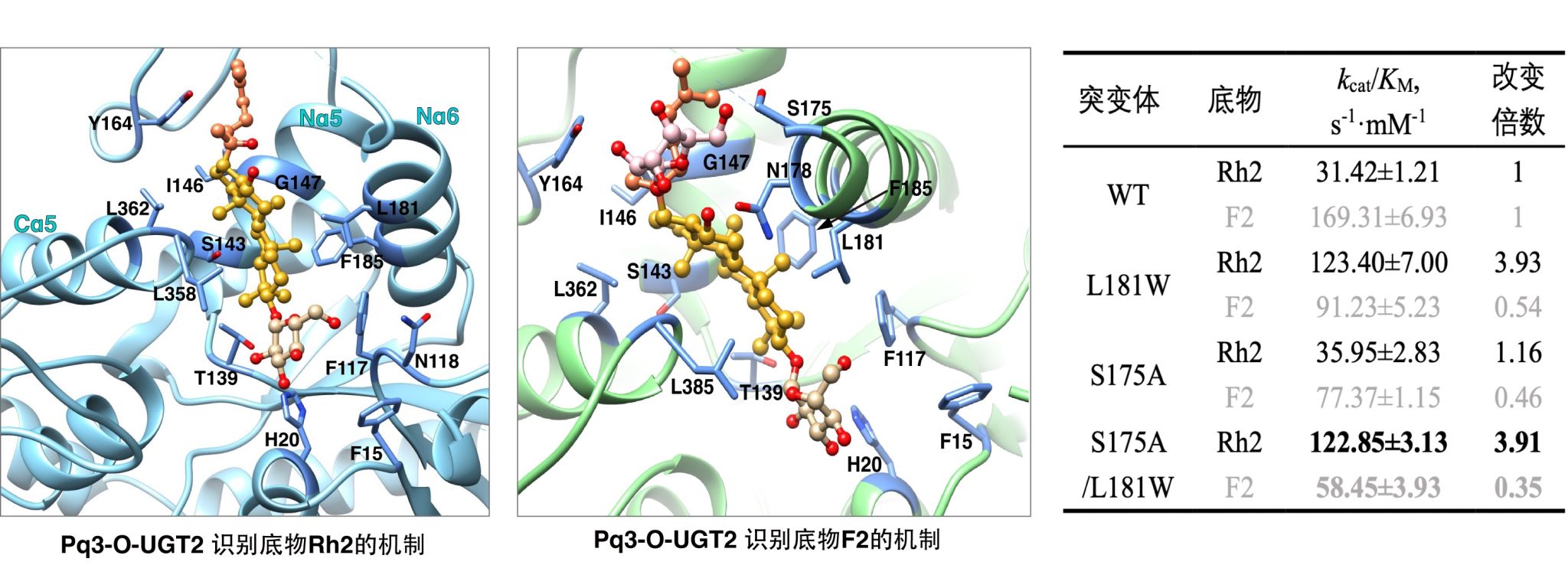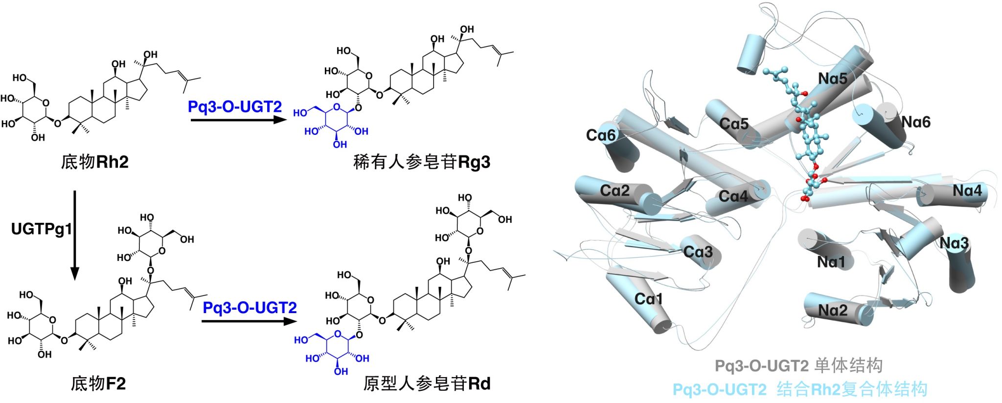 为了解决这个问题,天津大学科研团队使用了合成生物学技术。简单来说,就是通过构建微生物或植物细胞,让它们像“工厂”一样生产稀有人参皂苷。研究团队前期通过基因编辑、细胞器工程等合成生物学策略,构建了植物细胞工厂生产稀有人参皂苷。为了进一步提高产率,团队进一步聚焦这项技术的关键元件 -- 一种叫做“糖基转移酶”的蛋白质,它能够催化人参皂苷合成的最后几步反应,决定最终产物的种类和含量。然而,现有的糖基转移酶效率难以满足大规模生产的需求。天津大学研究团队聚焦稀有人参皂苷生物合成的关键糖基转移酶Pq3-O-UGT2,首次解析了它与底物结合的晶体结构。通过这项研究,团队发现这种糖基转移酶的底物结合口袋具有独特的取向和显著的疏水性,能够识别多种底物,包括不同的人参皂苷和一些黄酮类天然产物。基于这些发现,研究团队对该糖基转移酶进行了改造,成功构建了突变体。实验结果显示,改造后的酶更倾向于合成稀有人参皂苷,并且生产稀有人参皂苷的效率显著提高,为未来的大规模生产奠定了基础。