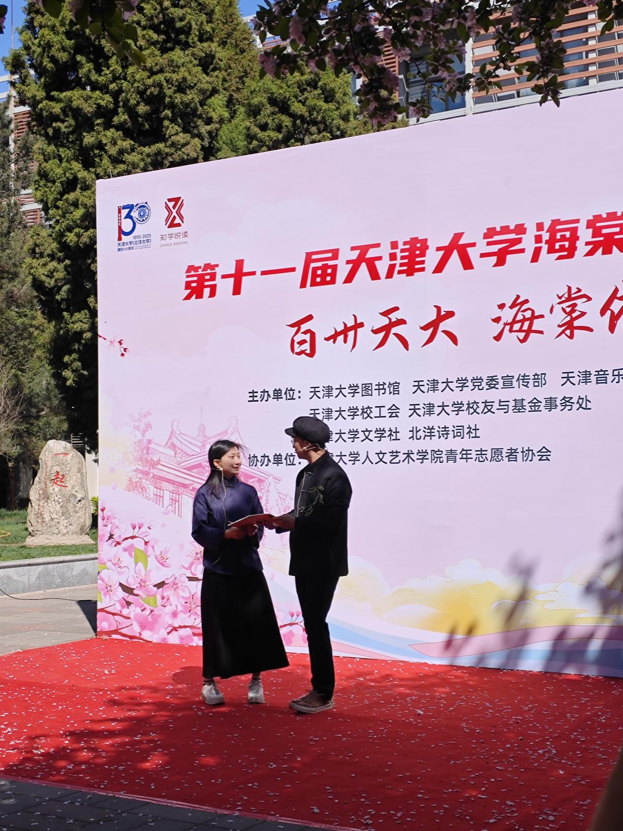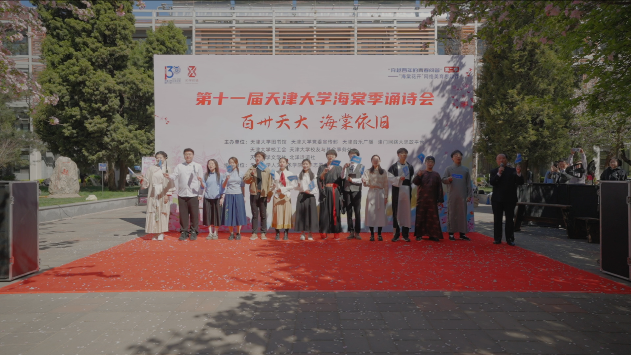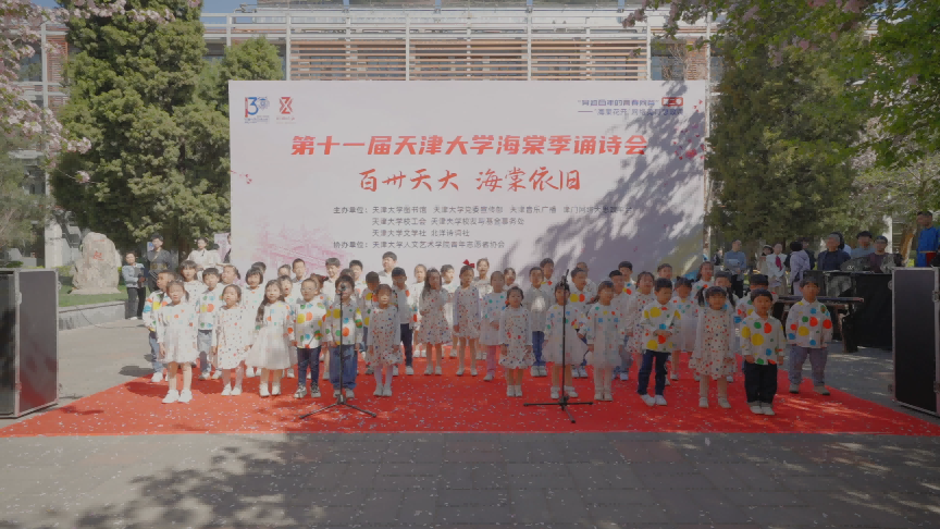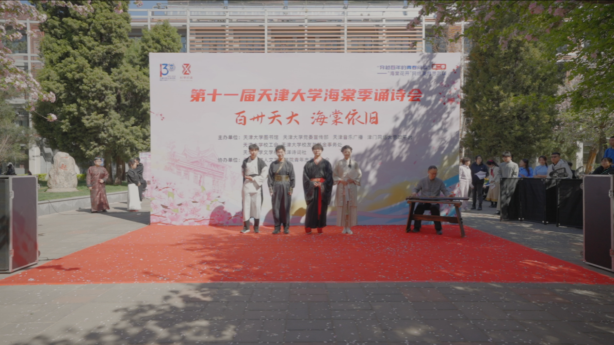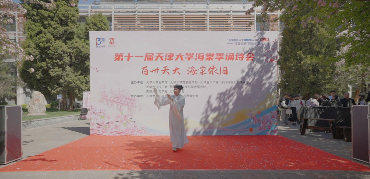 活动尾声:以诗为媒,文化育人厚植天大品格。全体诗会表演者合唱《天津大学校歌》,歌声与海棠齐放,为活动画上了圆满的句点。