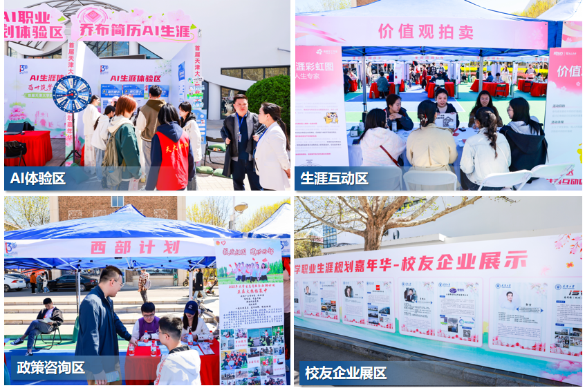 4月5日,在天津大学一年一度的海棠季当天,“百卅筑梦,海棠寻涯”首届职业生涯规划嘉年华在卫津路校区举办。这是一场融合科技、互动与专业指导的“职场嘉年华”。通过AI科技体验、沉浸式互动、专家咨询、政策服务、校友企业联动五大核心板块,为学生提供全方位的职业发展支持。3000余名学生通过互动体验完成职业探索,专家咨询量超400人次。
