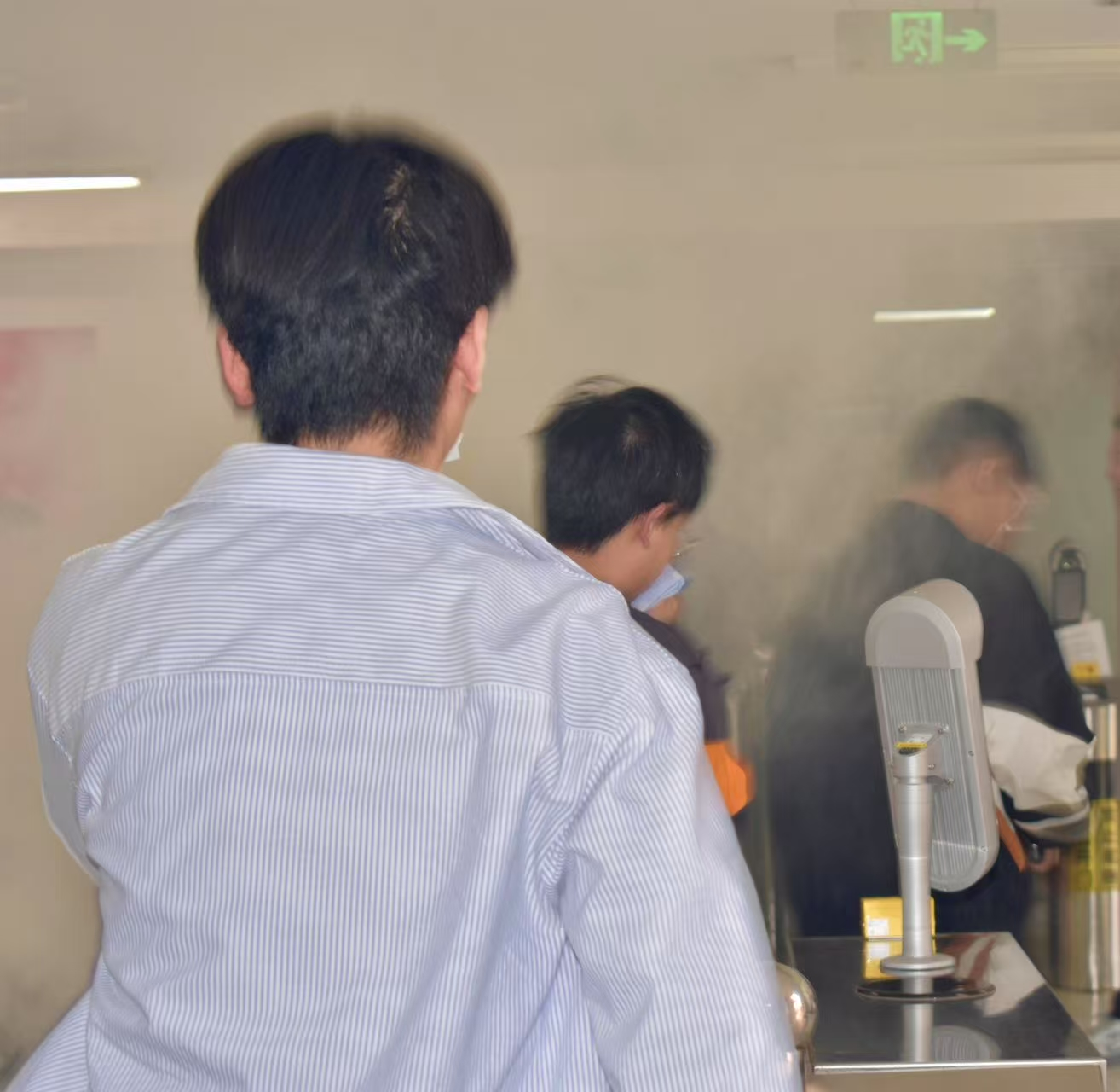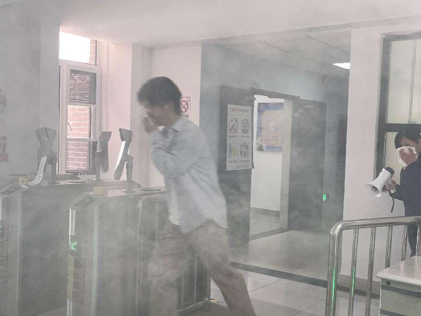 演练活动现场,伴随着消防广播的火情提示,模拟火场逐渐“浓烟滚滚”,物业值班人员一键开启宿舍楼内全部门禁、疏散门,打开大厅出口栅栏,保证疏散通道畅通。在工作人员的引导下,参与演习的同学们迅速反应,按照事先学习的火灾逃生技巧,用湿毛巾捂住口鼻,低姿弯腰,有序向既定的户外集合地点撤离。