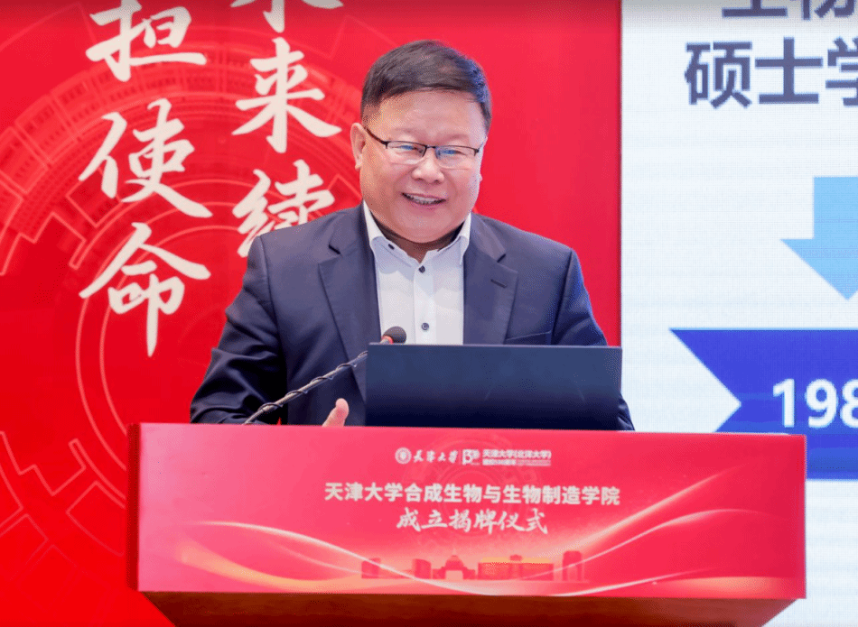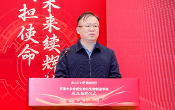 南京师范大学副校长黄和院士也向学院的成立表示热烈祝贺。他指出,天津大学作为我国第一所现代大学,具有悠久的历史和深厚的文化底蕴,始终是我国高等教育的先锋。此次成立合成生物与生物制造学院,是天津大学聚焦国家战略需求、瞄准世界科技前沿的战略性举措。期待与天津大学在人才培养、科研创新和学科建设等方面展开广泛深入的合作,共同推动我国合成生物与生物制造领域的快速发展。
