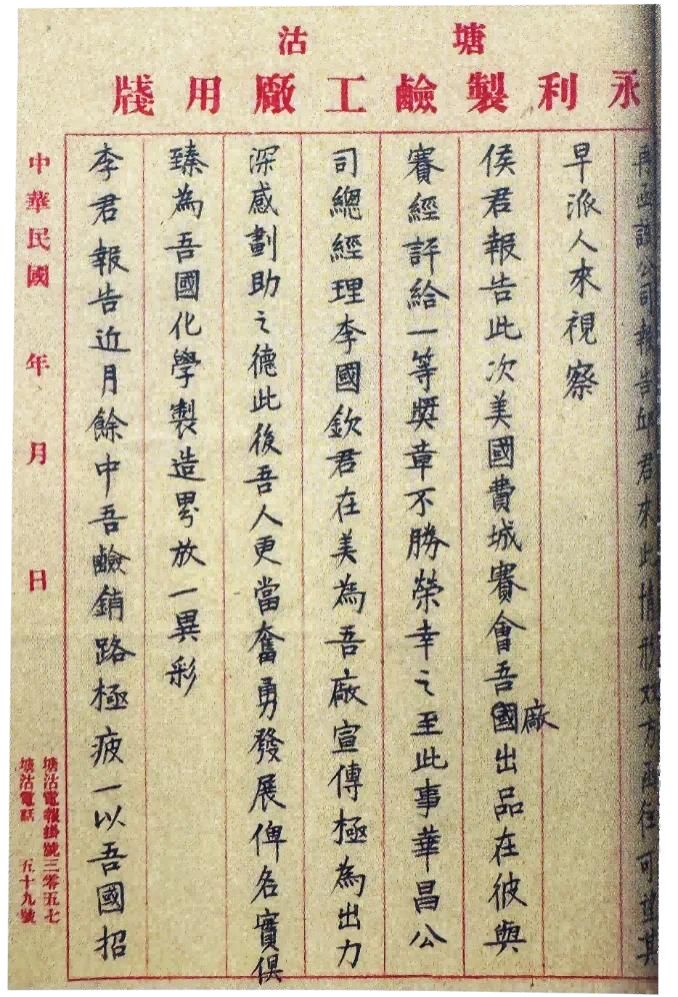1926年, “红三角”牌纯碱在美国费城万国博览会荣获一等奖。图为侯德榜通报这一消息的记录