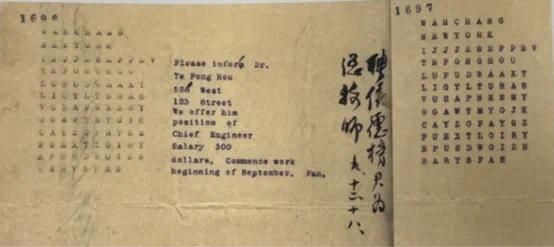 范旭东写给侯德榜的电文,聘侯德榜为永利碱厂总技师
