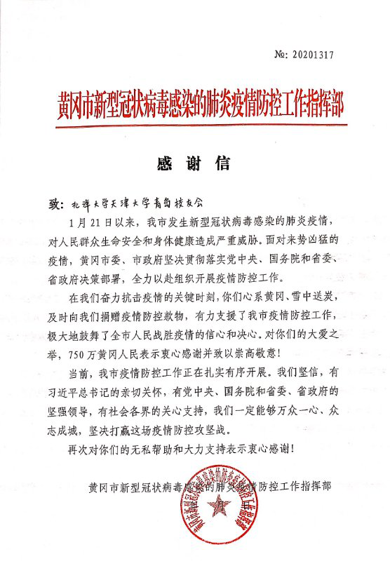 该批物资其他120箱医用丁腈检查手套通过天大湖北校友会捐赠给了黄冈市中心医院等湖北地区抗疫前线,为湖北人民抗击疫情贡献力量。受捐单位收到爱心捐赠物资后,纷纷发来感谢信,对天大青岛校友“相知无远近、万里尚为邻”的善举表达感激之情。