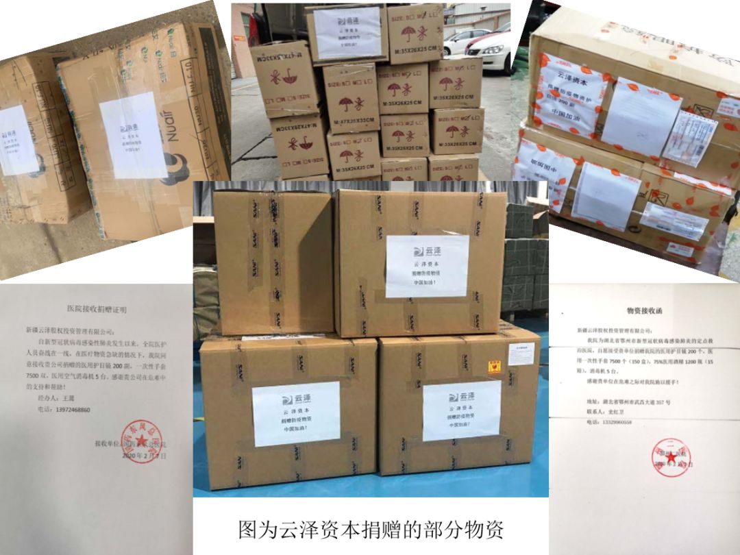 疫情发生以来,天津大学新疆校友2010届管理科学与工程马云也第一时间响应,他所属企业云泽资本成立“抗击疫情驰援湖北专项小组”。因疫情爆发突然,国内医疗物资产能不足,云泽资本全力调动各方资源力量,通过俄罗斯、澳洲、美国、哈萨克斯坦等多方途径寻找货源,首批海内外采购医用手套15000双、医用隔离面罩700副、防冲击护目镜400副,医用消毒机10台等物资,完成复杂的清关手续,协调进鄂物流,陆续直接发往鄂州二医院、十堰国药东风总医院。