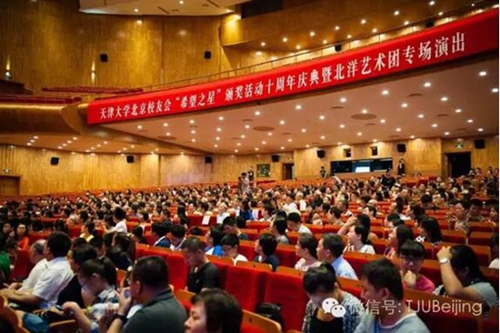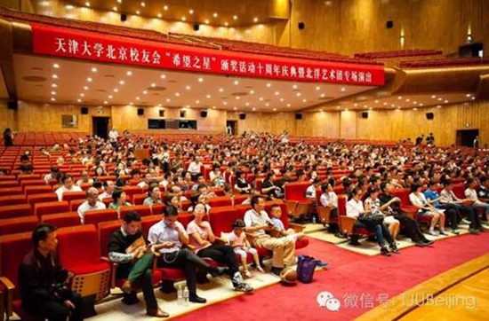 本站讯 9月11日清晨一场秋雨卷走了夏日的最后一丝暑热,雨后的北京天高云淡,坐落于燕园三角地的北大百年讲堂庄严肃穆,当日下午,天津大学北京校友会“希望之星”十周年庆典暨北洋艺术团专场演出在这里隆重举行。