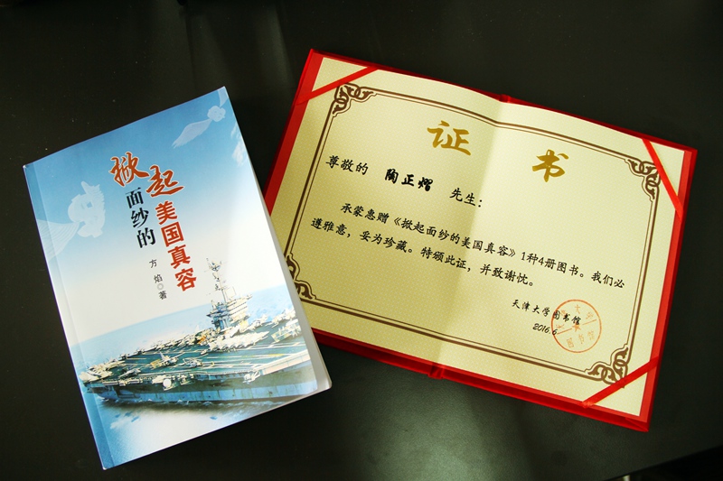 本站讯近日,天津大学校友总会收到鲁泽美老师转来现居美国的陶正熠学长赠送母校的其所著《掀起面纱的美国真容》一书。