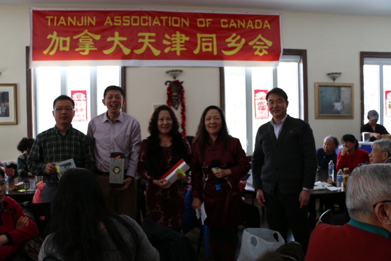 会场设在庄园别墅的一间大厅内,墙壁上挂着天津大学加拿大校友会的会旗和南开大学、耀华中学校友会、天津同乡会的旗帜。窗户上贴着吉祥图案的大红窗花,校友们和天津老乡们围坐在十几张圆桌旁。屋外白雪皑皑,冰天雪地,屋里人声鼎沸,笑声阵阵,一派红火。