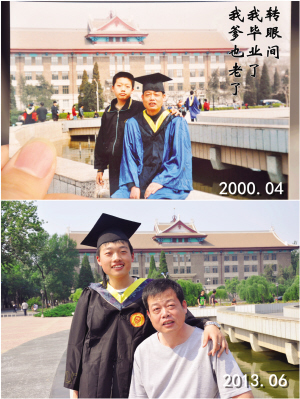 天津北方网讯13年前,父亲柴宝连穿着天津大学硕士服,在9岁儿子的陪伴下,在校园九楼前留下了一张合影。13年后,儿子柴澍靖在天津大学本科毕业,他穿上学士服,在父亲的陪伴下又留下了一张合影。昨天,这组“穿越”13年的父子合影在网上感动了无数人。13年过去了,仍是同样的地点,同样的毕业季,甚至父子二人还是同样的姿势。不同的是,儿子长大了,而父亲的头发却花白了,背也弯了。