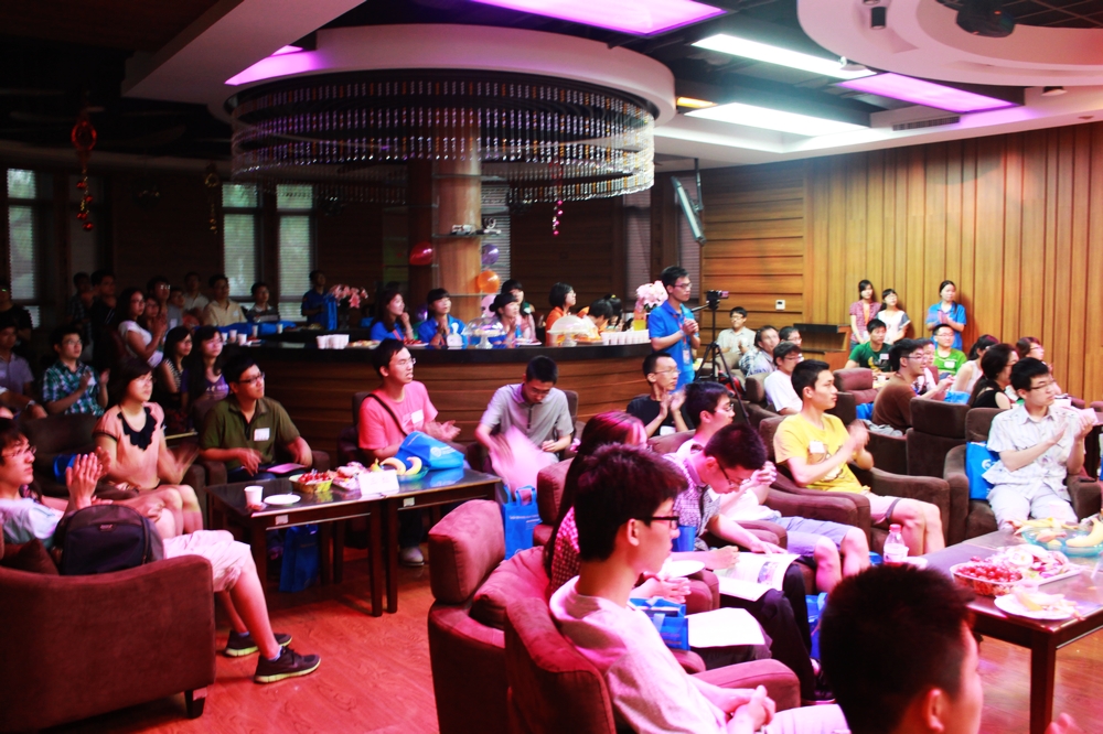 活动最后是精彩的游戏环节。在猜词游戏中,3个同学为一组,两个人来说一个人来猜,每组十个词,最短时间内猜对词数最多者获胜。5组同学风格迵异,猜词过程中引起的各种笑话让大家捧腹大笑。在吹乒乓球游戏中,同学们在回答主持人部里的同时尽量吹掉瓶子上的乒乓球,100秒时间内落球次数最多者为胜。