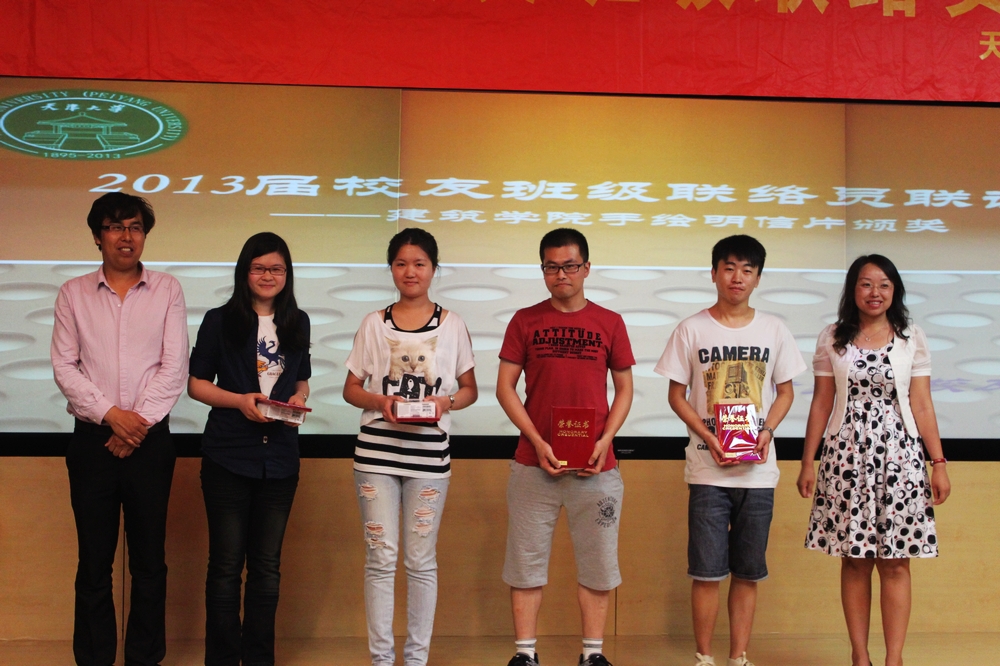 活动还对 “天大手绘明信片大赛”进行颁奖。在前段时间校友总会举办的该赛事中,来自建筑学院的曹世彪、郭婧舒、王金晖和张博琳,4名同学分获一二三等奖,王葳和建筑学院辅导员闫佳亮为他们颁奖,并送上校友会精心准备的礼物作为奖励。