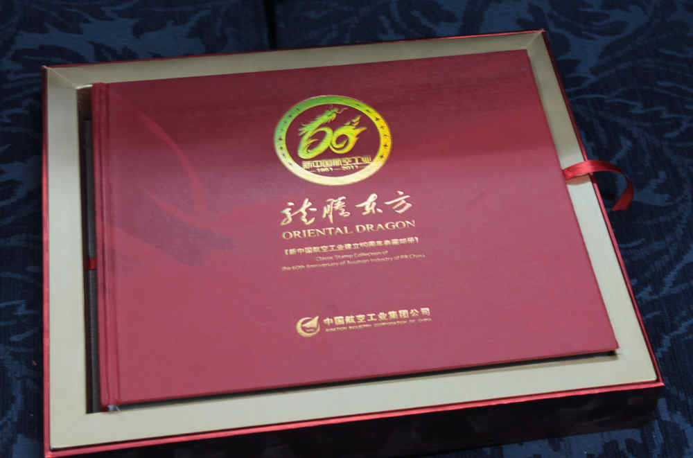 该邮册以典型的东方红为底色,封面刻印着烫金大字:新中国航空工业建立六十周年典藏邮册,上方刻印着一条腾飞的中国龙,象征着祖国的航空工业事业正在蓬勃发展、蒸蒸日上。邮册的每一页上,都印有十分精美的与航空工业有关的邮票,可以让人们直观地感受到祖国航空事业的发展与进步。