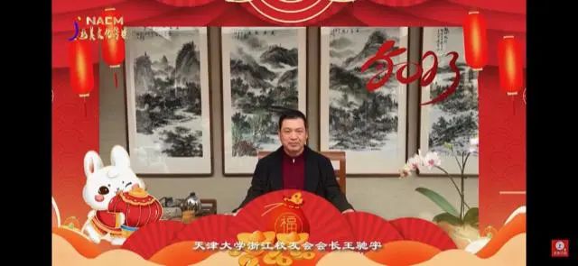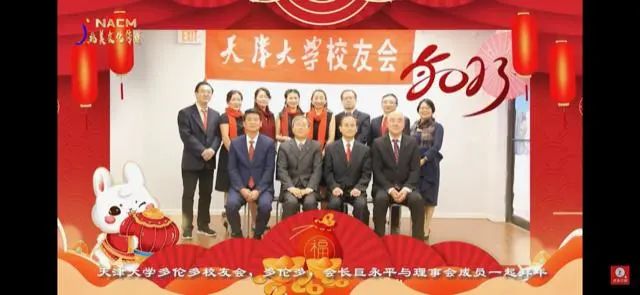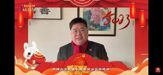 天津大学(北洋大学)北美校友会前会长徐德清,南加州校友会理事长阚晶,芝加哥校友会会长王涛,波士顿校友会会长周雄伟,大华府校友会会长马炜祎,休斯敦校友会会长张钊,乔治亚校友会会长许军,亚特兰大校友会裘盛宏,温哥华校友会会长张铁权,卡尔加里校友会会长陈迅,多伦多校友会会长巨永平和校友会骨干,渥太华校友会会长郭建平和校友会骨干也都为大家呈上新年祝福,祝愿校友们在新的一年里大展宏图,祝愿母校早日建设成世界第一流大学。