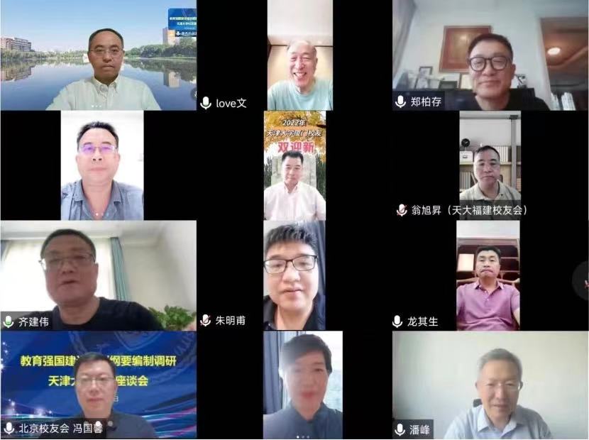 6月17日下午,天津大学召开线上校友座谈会,开展教育强国建设规划纲要编制调研,围绕“建设什么样的教育强国、怎样建设教育强国”这一时代课题,听取校友们对教育强国建设、高等教育发展以及天津大学世界一流大学建设的意见建议。天津大学党委常委、常务副校长胡文平出席会议并讲话,来自北京、河北、上海、江苏、福建、河南、湖南、广东、广西等地的10位校友会负责人及校友总会相关负责人参加会议,校友与基金事务处处长、校友总会秘书长潘峰主持会议。