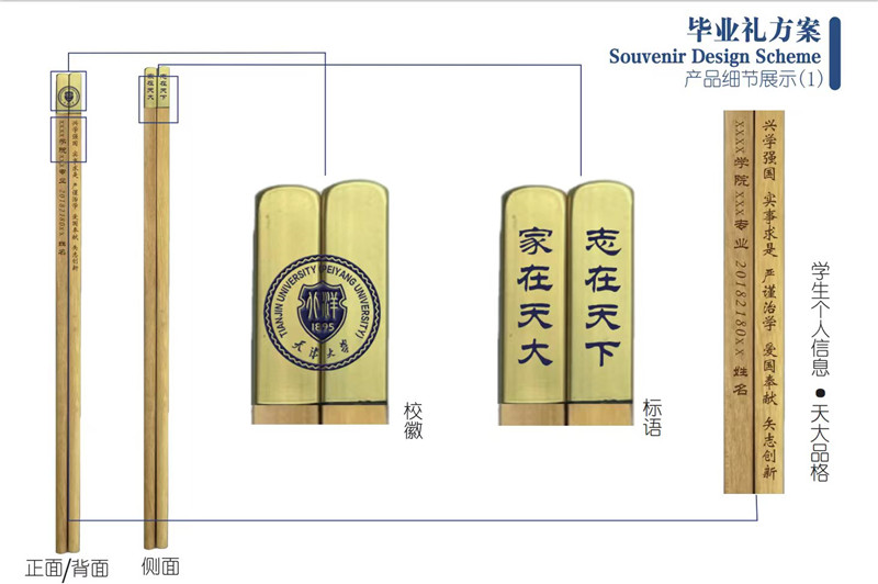 一双筷子合在一起可以拼成校徽图案,还能看到母校对你的祝福与惦念——“家在天大,志在天下”。