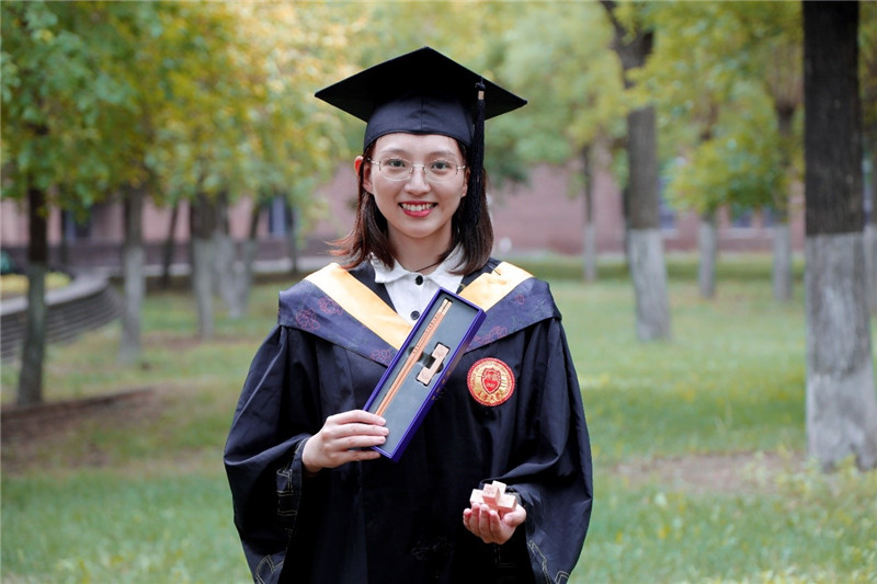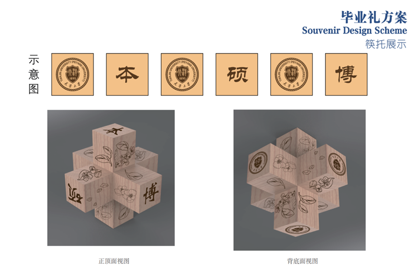 筷子托上雕刻海棠花图案、校徽及本硕博字样。悄悄告诉你,筷子托还是件智力玩具,本硕博三个托可以通过榫卯结构,组成 “好汉锁”。 获得不同学位的毕业生可以拿出来组合,玩一玩。而这个过程也是母校对毕业生的期许——凝心聚力、共扬校誉无穷。