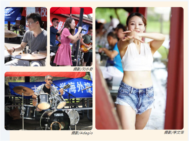 在联谊活动因不期而至的大雨而中断的时候,校友们并没有被雨水浇灭热情,而是继续在凉亭里吹拉弹唱,将联谊野餐变成一场大型群体卡拉OK。一首首经典的流行歌曲和校园民谣,让大家仿佛回到曾经的青葱岁月和难忘校园。