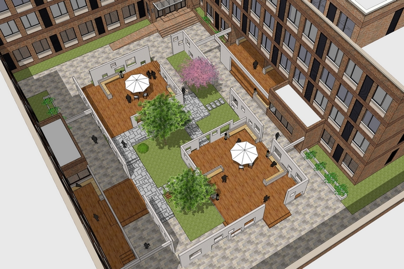 为了将生活区建设成为多层次、尺度宜人的场所,让学生在宿舍区内能够充分交流、打破以往三点一线的单调的学校生活方式,设计人员在空间布局上,将地块划分成生活区、休闲区、后勤区以及二期预留用地四个部分。生活区采用院落围合的方式,体现以学生生活为中心的设计理念,创造半开放式的院落空间。院落的第一层次为半开放的广场,利于人流的集散;院落的第二层为相对私密的生活交往空间,让学生们在组团内部形成轻松愉悦的氛围。