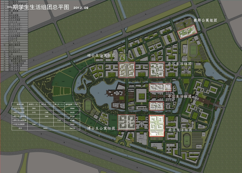 天津大学新校区生活设施共分北区、中区、南区、硕士生、博士生、教师公寓6个组团,位于新校区中心区域,总建筑面积近30万m?,其中每个组团由一个或多个地块组成,每个地块中包括1个或多个功能用途,并规划了预留用地。