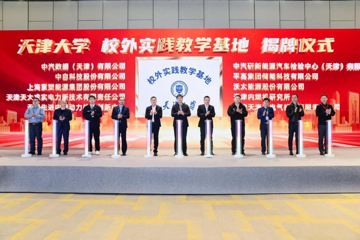 为感谢并巩固与优秀企业的合作,会议举行“校外实践教学基地”授牌仪式。天津大学未来技术学院党委书记凌国维,天津天海源电气技术有限责任公司副总经理杨宁,天津内燃机研究所副所长白富强,沃太能源股份有限公司总裁王珺,平高集团储能科技有限公司总经理杨振元,中汽研新能源汽车检验中心(天津)有限公司首席专家郝冬,中汽数据(天津)有限公司总经理何绍清,中自科技股份有限公司董事长陈启章,上海重塑能源集团股份有限公司高级经理王佳元,天津天大求实电力新技术股份有限公司葛少云,无锡先进内燃动力技术创新中心副主任肖刚共同为教学基地揭牌。