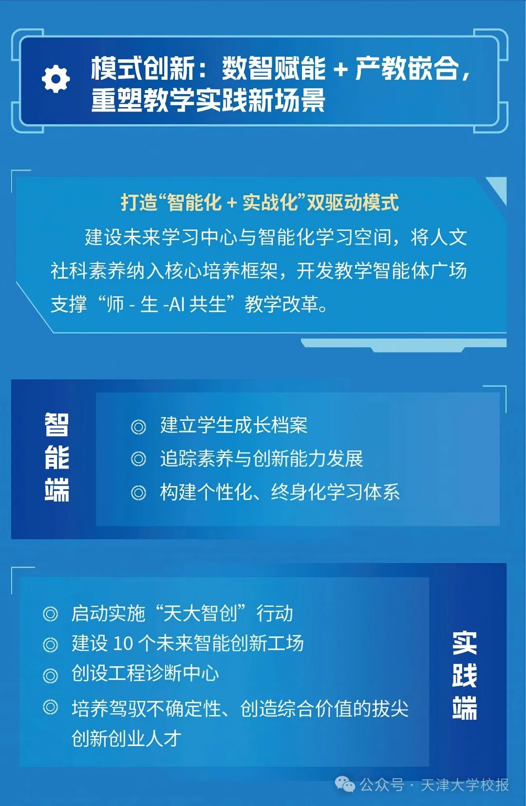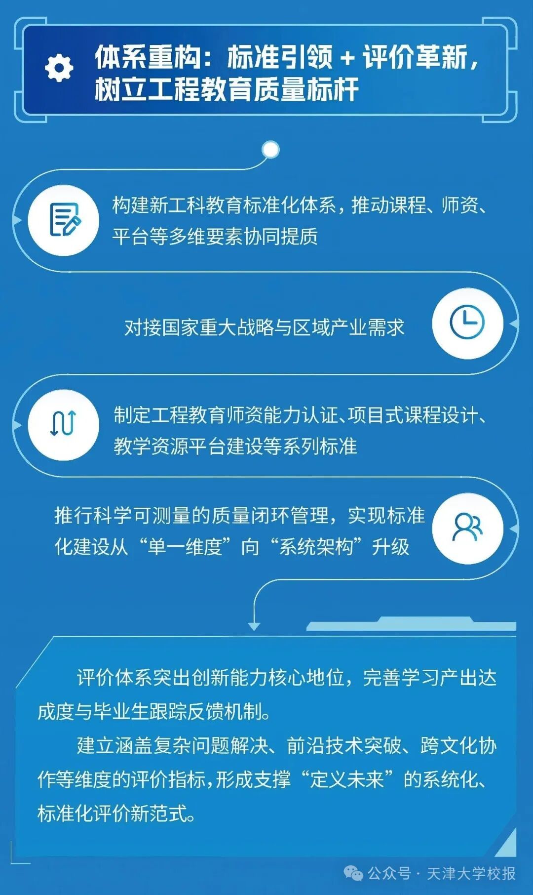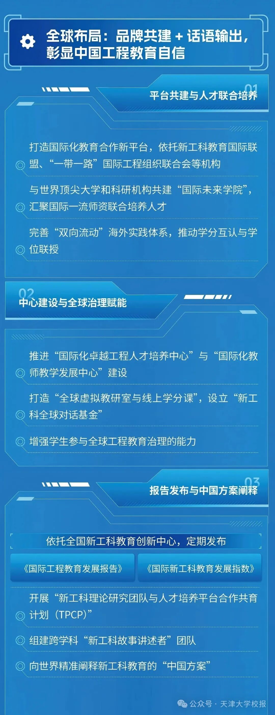 天津大学认真贯彻落实习近平总书记重要回信精神,面向全球科技与产业变革,积极探索创新发展新路径,主动应对工程教育面临的“工程标准化、教育全球化、知识体系化、学科交叉化、产业智能化”五大挑战,服务教育强国建设,持续发挥数智时代工程教育改革引领作用,为服务全球可持续发展提供系统性“中国智慧”。坚持立德树人、坚持守正创新、坚持系统重构,主动超前布局、着力应对变局、奋力开拓新局,面向未来启动实施天津大学未来卓越人才培养计划,即天津大学新工科建设方案3.0,建立数字智能与智慧时代工程教育新范式,引领国际工程教育转型与发展。