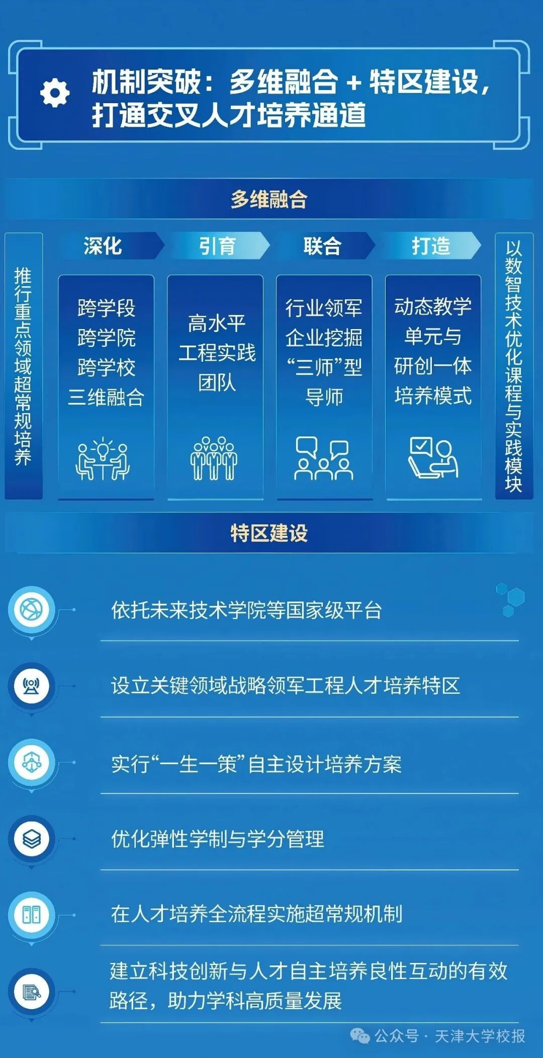 打造交叉培养特区,设计弹性融合发展路径。围绕国家战略需求与产业前沿,依托国家未来技术学院等国家学院,打破学校、学院、学科边界,落实“一生一策”,支持学生自定义专业与培养方案,优化弹性学制与学分管理,打造关键领域战略领军工程人才培养特区。在人才培养全流程实施超常规机制,推动人才自主培养与自主创新,建立科技创新与人才自主培养良性互动、带动学科高质量发展的有效机制,共建高水平科研育人创新全方位融合支撑机制。