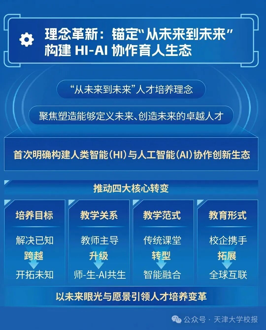 培养定义未来的卓越领军人才。超前感知人工智能等数智技术可能带来的深远影响,构建人类智能(HI)与人工智能(AI)协作创新生态,加速拓展人类认知边界,以未来眼光与愿景召唤未来。推动培养目标从“解决已知”向“开拓未知”转变;教学关系从“教师主导”向“师-生-AI共生”转变,教学范式从“传统课堂”向“智能融合”转变,教育形式从“校企携手”向“全球互联”转变。强化思政引领,厚植家国情怀与人文情怀,培养具备锚定未来方向的战略领导力、洞察未来趋势的系统建构力、引领未来变革的生态创新力,能够定义未来和创造未来的卓越人才。