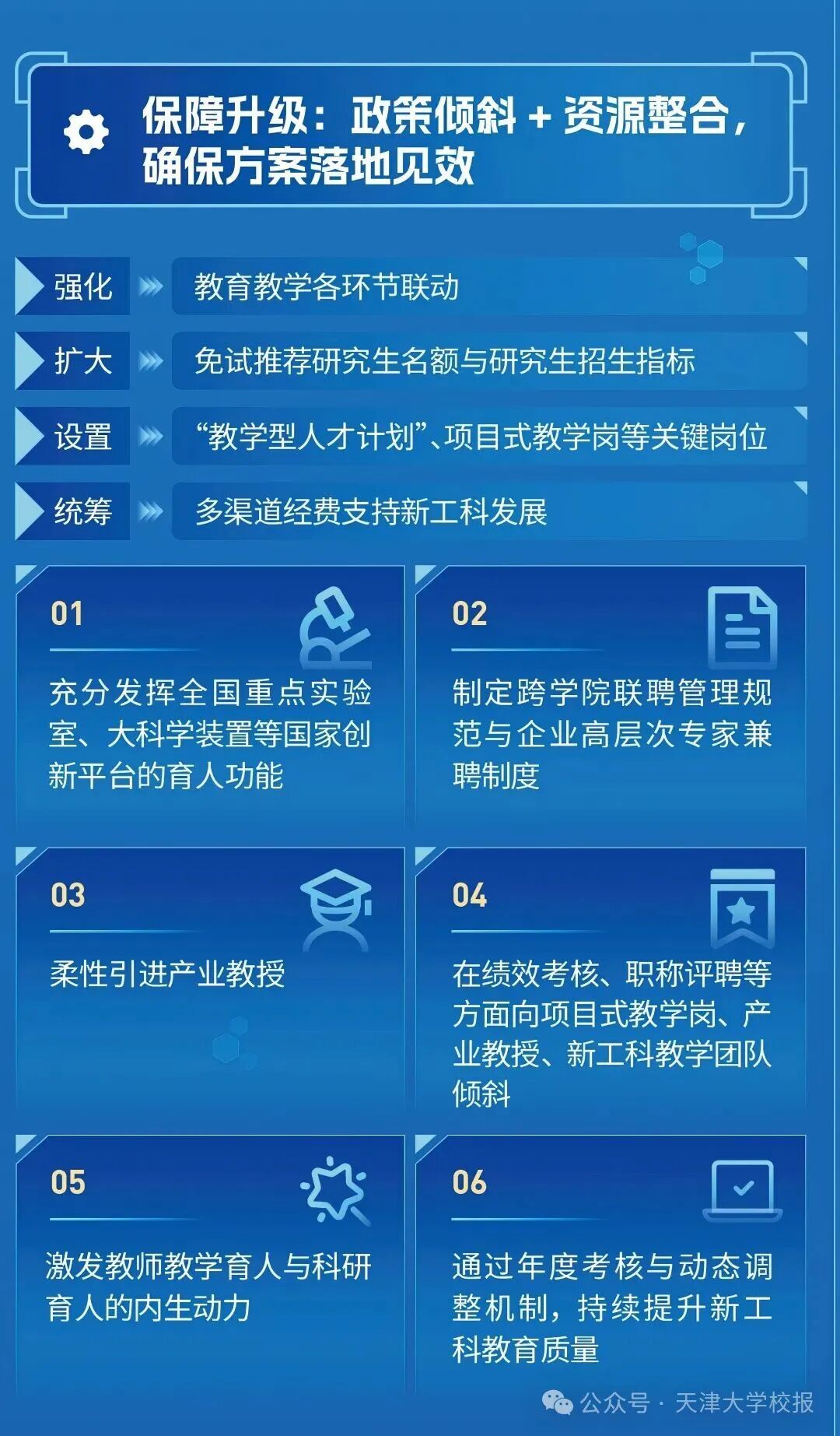 完善新工科保障与激励制度。强化教育教学各要素、各环节联动,推动各教学单位制定相关政策举措保障计划落地实施。扩大免试推荐研究生名额、研究生招生指标,设置“教学型人才计划”、项目式教学岗等关键岗位,统筹中央高校教育教学改革专项、“两重”“两新”等多渠道经费,支持新工科教育发展。进一步激发全国重点实验室、大科学装置等国家创新平台的人才培养功能,强化新工科教育质量共同体意识,提升教师新工科教学能力,加强教育教学督导监测和人才培养成效评价,开展新工科人才培养平台年度考核,实施动态调整机制。制定跨学院联聘管理规范,推动实施企业高层次专家兼聘制度,柔性引进企业高层次人才担任产业教授,在绩效考核、职称评聘等方面向项目式教学关键岗、产业教授、新工科教育教学团队、新工科基层教学组织等予以倾斜,激发教师教学育人、科技育人的潜在动力。
