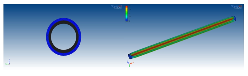 为了验证试验结果的准确性,团队自主开发的有限元软件,具有深水立管外压压溃和屈曲分析功能,计算准确性不低于商业软件的91%,软件计算结果与试验偏差不超过4.8%,并通过了第三方认证。软件核心优选向量式有限元方法,具有处理多非线性问题的优势,适用于求解大变形、大变位问题。完成了算法设计及向量式有限元核心代码的开发和调试;优化了程序效率,采用并行技术,计算时间节省92%。