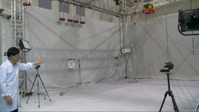 试验室长15 米,宽10米,高10米,在试验室中部设置1套放置运动模拟器的绗架框架,框架设置可调节高度的上下移动绗架平台。运动模拟器安装在上下移动绗架平台的中间位置,试验时运动模拟器在电脑控制下模拟海工平台运动,四周设置工作船轨道和悬挂模拟管线,上下移动绗架平台最高达8米,地面铺设海图,框架水平中心位置及为海图中海工平台的中心位置。该实验室在Tchnip公司研制的静态模型基础上增加了很多新功能,就模拟性能而言,增加了动态模拟的功能以及配套的结果捕捉工具,同时模拟深度也有所提升,最高可模拟10000m的深水海况。其可在大型海洋平台、水下系统和管线安装、定位和生产工况作全方位即时模拟,因而对突发性的灾害进行预测和报警,为油田开发作业过程中的安全运行提供保障。