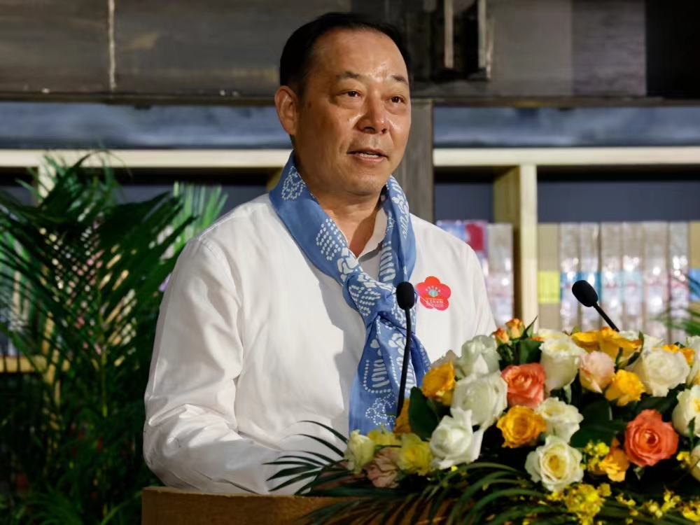 在仪式现场,冯研院非遗中心与五个基地的合作方——浙江省瑞安市人民政府、浙江省嘉善县西塘镇人民政府、天津市西青区杨柳青镇人民政府、江苏南通蓝印花布博物、天津市南开区文旅局及天津天后文化传播交流中心,共同签署了合作协议。冯骥才先生与天津大学党委书记杨贤金、副书记雷鸣共同向基地授牌。南通蓝印花布田野教学基地还当场发布了重磅成果《中国蓝印花布文化档案·南通卷》。这部沉甸甸的新书是《中国蓝印花布文化档案》的示范卷,由基地聘任的兼职教授、中国民协副主席、南通蓝印花布印染技艺国家级非遗传承人吴元新主编。作为五个田野教学基地的代表,吴元新说:“被授予田野教学基地,既是荣誉也是责任。我们一定会践行冯先生的非遗学教学理念,履行好教学基地的相关任务。也希望老师同学们深入田野,和传承人打成一片,了解传承人的所思所想,帮助解决传承中的困难。让我们携手为我国非遗的保护传承工作保驾护航。”