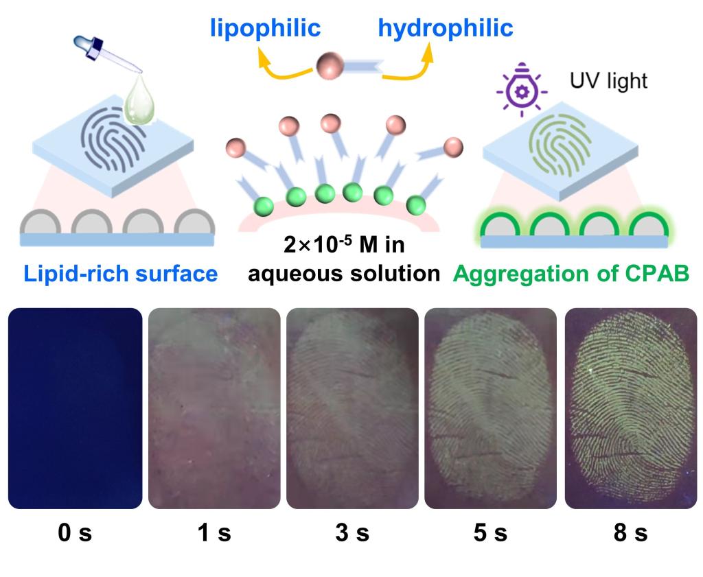天津大学李振、谢育俊团队研发了一种新型两亲性指纹显影剂。这种显影剂在空气中研磨可使其发光颜色产生变化,还可以自行恢复;该显影剂以水作为溶剂,不仅避免了对指纹精细结构的破坏,而且在各种基质均有良好的显影效果。特别值得一提的是,该显影剂不仅工作浓度低、显影时间短,而且其获得指纹显影图像的分辨率极高,对三级指纹细节尤其具有非常清晰的可视化效果。