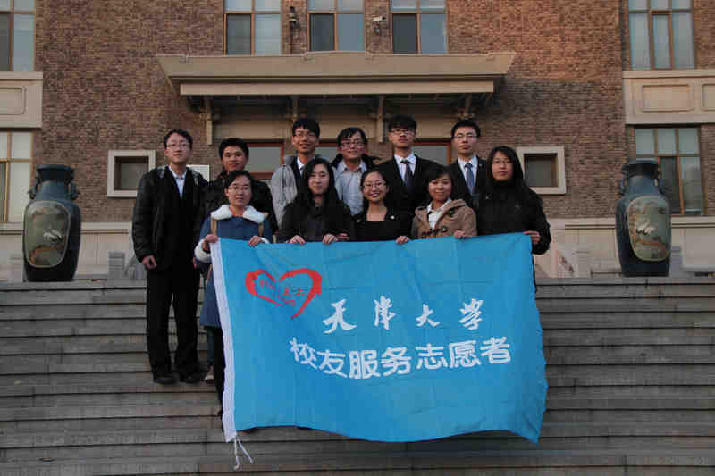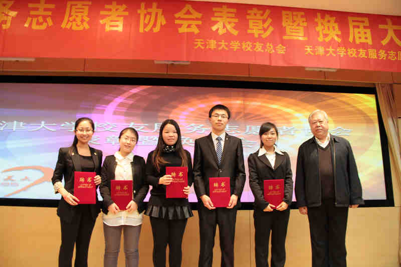 在一片掌声中,嘉宾与志愿者合影留念,2013年天津大学校友服务志愿者协会表彰暨换届大会圆满落下帷幕。(学生志愿者 彭禛夷报道)
