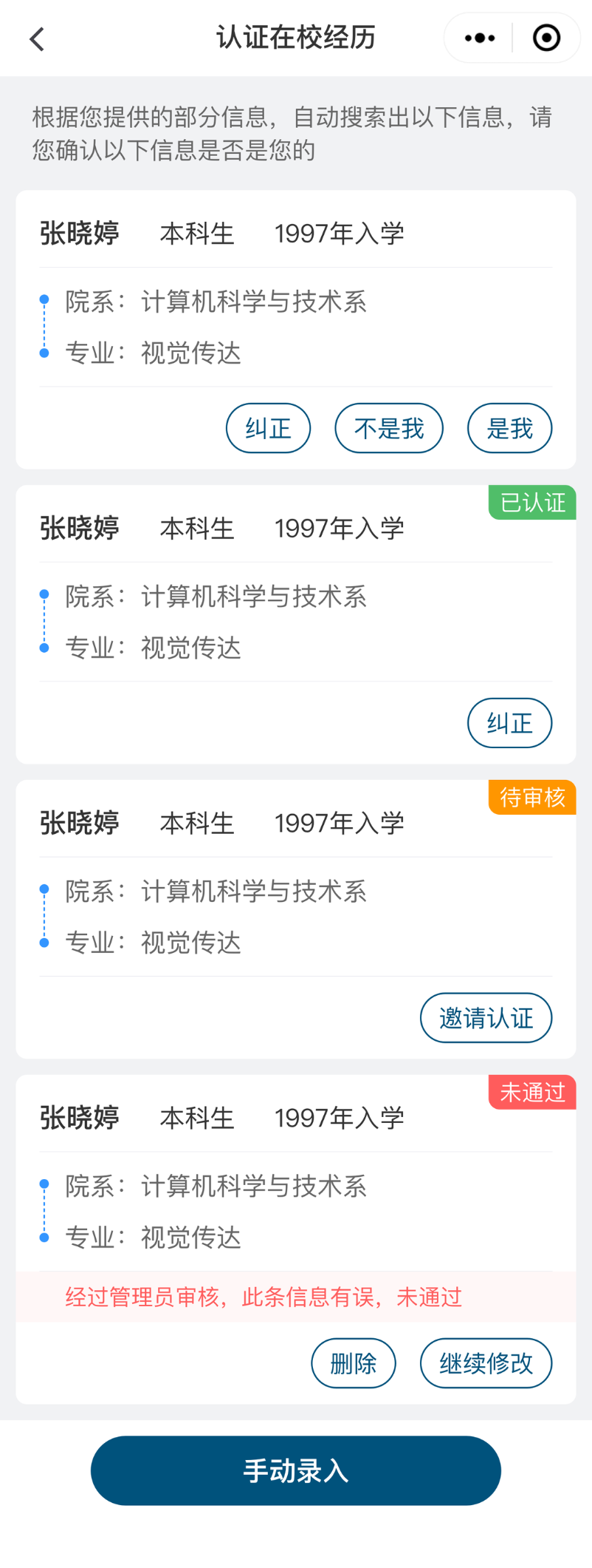 如果实人认证是通过人脸识别的方式验证,可能会自动关联出相关的在校经历,如果没有自动关联,请手动填写在校经历认证。