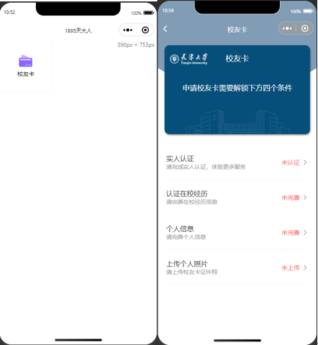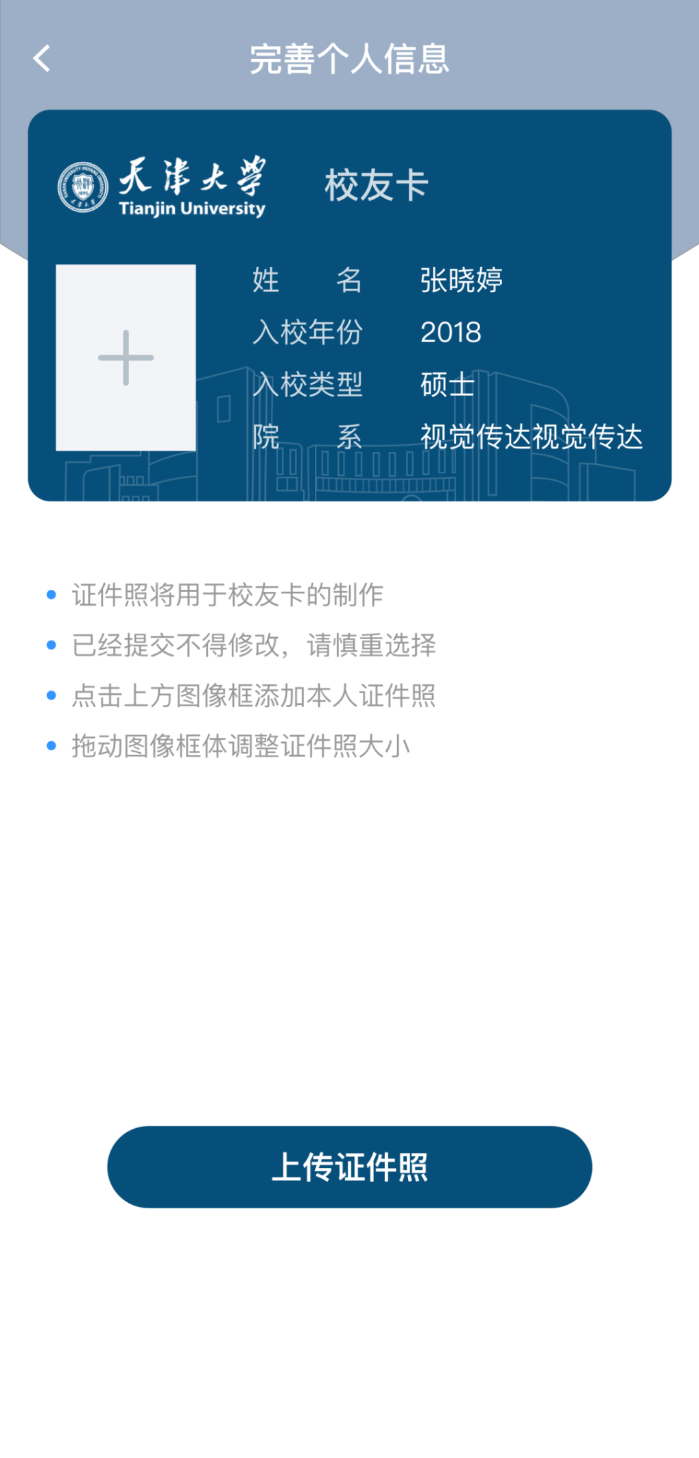 ②点击校友卡模块,根据提示依次完成各项信息认证