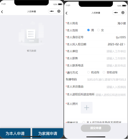 ①成功认证身份的校友,可在首页看到入校申请模块,点击进入