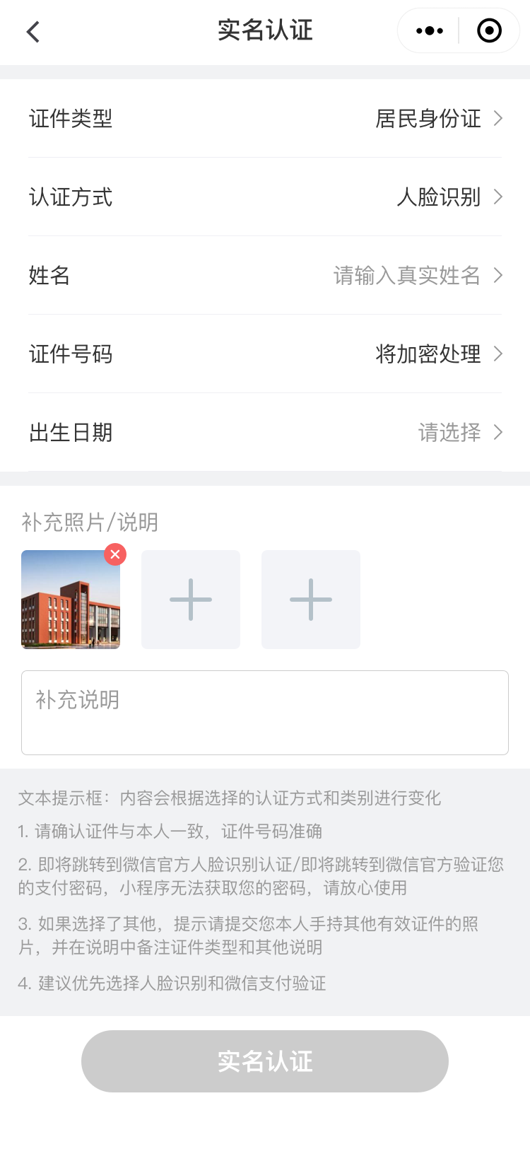 请选择证件类型,输入姓名、证件号、生日后提交认证,建议选择居民身份证、人脸识别的方式。